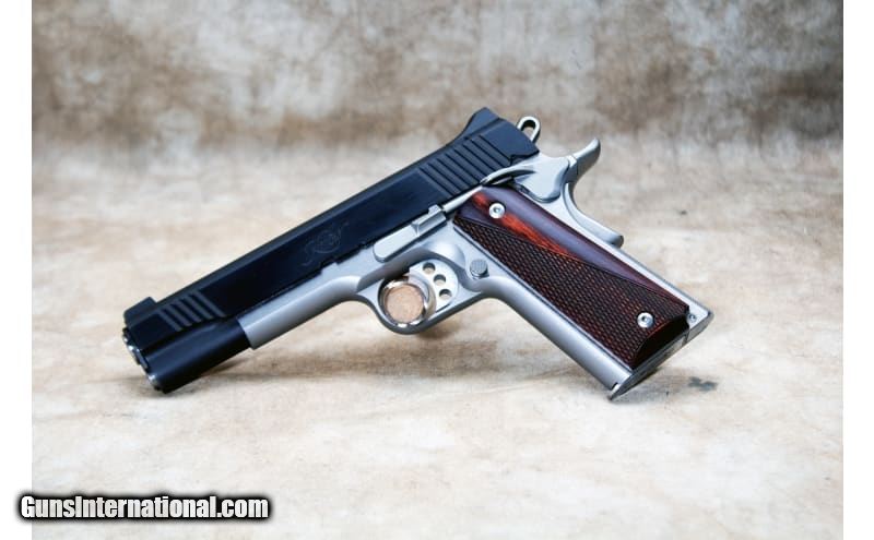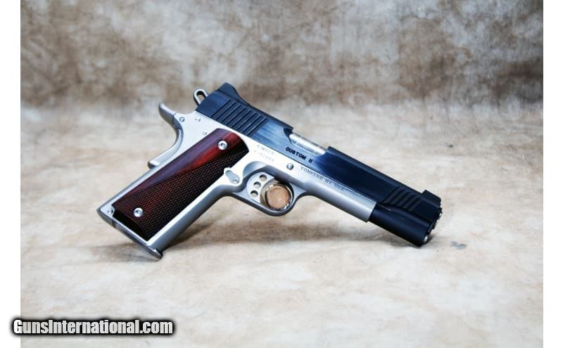 Description: This is a used Kimber Custom II (Two-Tone) semi-automatic pistol, chambered in .45 ACP. This comes with one magazine and the original box, plastic bushing wrench, manual and marketing materials. .45 ACP SOLD Metal Condition: Excellent Wood Condition: Excellent Bore Condition: "Bright and shiny, strong rifling Barrels: 5 Triggers: "Aluminum, three hole standard, factory setting (approximate pounds): 4.0 - 5.0 Weight: 38 oz Sights: Fixed low-profile Item Location: St. Charles, MO |