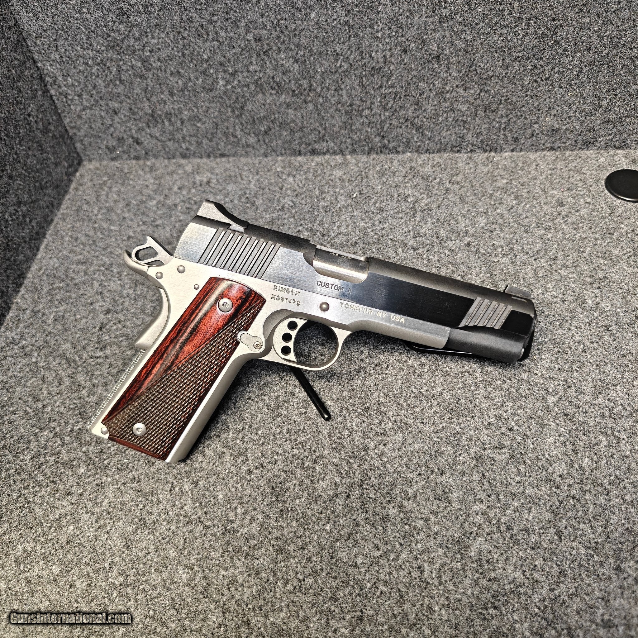 Description: Guns Listing ID: 578157 Comes with three: KimPro Tac - 8 round magazines! Kimber® has gained a solid reputation for manufacturing highly accurate M1911-style pistols, offered with a wide range of custom features direct from the factory. The Custom II Two-Tone Semi-Auto Pistol features a brush-polished steel slide finished in matte black, and a brush-polished stainless steel frame. A fully supported match-grade barrel, fitted to the slide with a match-grade stainless steel bushing for incredibly consistent accuracy. A full-length, steel guide rod ensures reliability. The slide and frame of the Custom II are machined with precision, resulting in a superior slide-to-frame fit for smooth, reliable cycling. Checkering on the mainspring housing, along with checkered rosewood grip panels provide a solid, non-slip hold. An extended beavertail grip safety ensures a high grip; and protects the hammer when carrying the weapon cocked and locked, while minimizing hammer-bite to theof the shooter‚s hand while firing. The slide features cocking serrations at the front and back. An aluminum match-grade trigger is factory set to break clean and crisp for precise shot placement and enhanced control during rapid fire. Low profile steel, 3-dot sights get on target quickly. The Kimber Custom II Two-Tone Semi-Auto Pistol is a reliable sidearm for self-defense that is capable of delivering rapid, well-placed shots with the powerful .45 ACP cartridge. Match-grade barrel Match-grade stainless steel bushing Brush-polished black slide Brush-polished stainless steel frame Precision machined slide and frame Checkered mainspring housing Aluminum match-grade trigger Checkered rosewood grip panels 3-dot steel sights SOLD Manufacturer: KIMBER Model: Custom II Caliber Info: .45 ACP Condition: Used - Non-Certified Barrels: 5" BARREL Action: SEMI AUTOMATIC |
