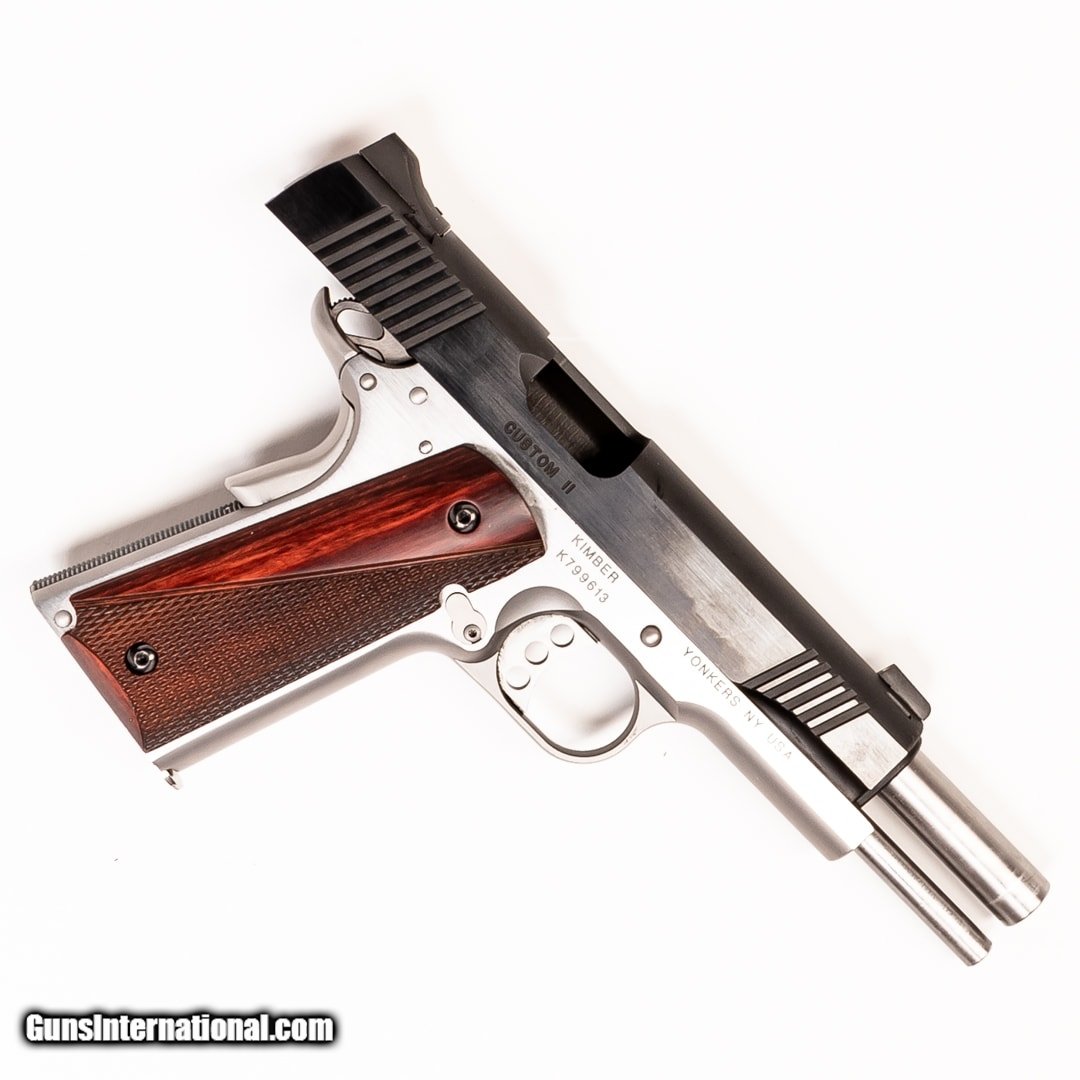 Description: Guns Listing ID: 503166 The Kimber Custom II is an impeccably well-made 1911 with a two-tone black & stainless design. This will make a fantastic self-defense sidearm and target shooter. 1-7 round magazine, the original case, manual, and a bushing tool are included. Kimber‚‚s are proudly made right here in the U.S.A SOLD Manufacturer: KIMBER Model: CUSTOM II Caliber Info: .45 ACP Condition: Used - Certified Barrels: 5 BARREL Finish: TWO TONE BLACK AND S |