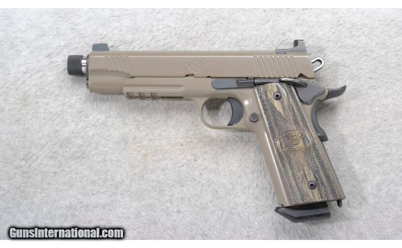 Description: This Kimber Model Desert Warrior is a right hand semi-auto pistol in .45 ACP Cal. It has a 5.5 inch threaded end barrel with a front and rear serrated slide. A blade front sight and notch rear sight with luminous sight dots. The grip panels are a diamond checkered hardwood laminate. It has a lower accessory rail. .45 ACP SOLD Chambers: 7 shot magazine. Metal Condition: Excellent. Bore Condition: Excellent. Barrels: 5.5 inch threaded end barrel with a front and rear serrated slide. Weight: 42 oz. Sights: Blade front. Notch rear. Luminous sight dots. Item Location: Richfield, WI |