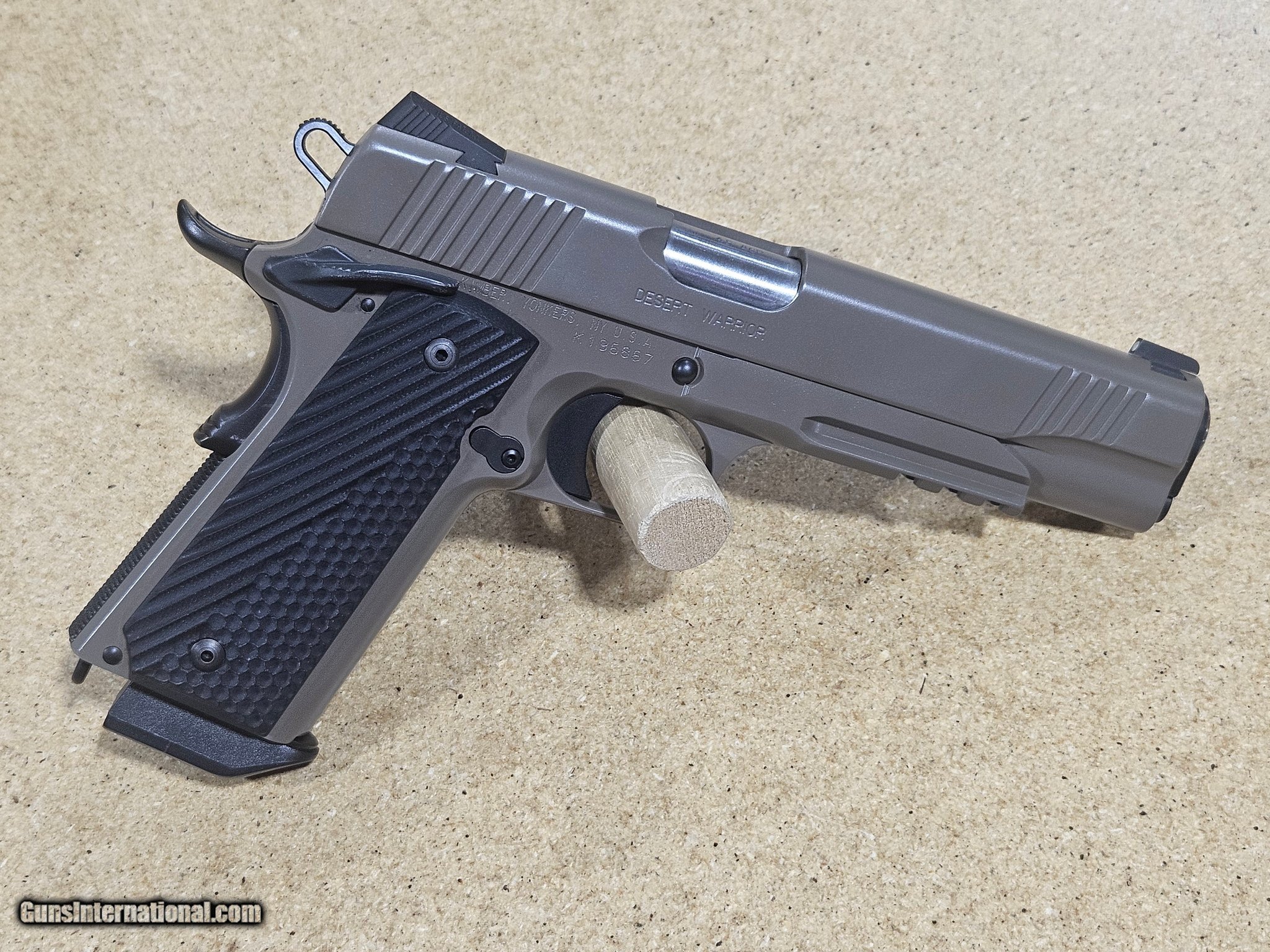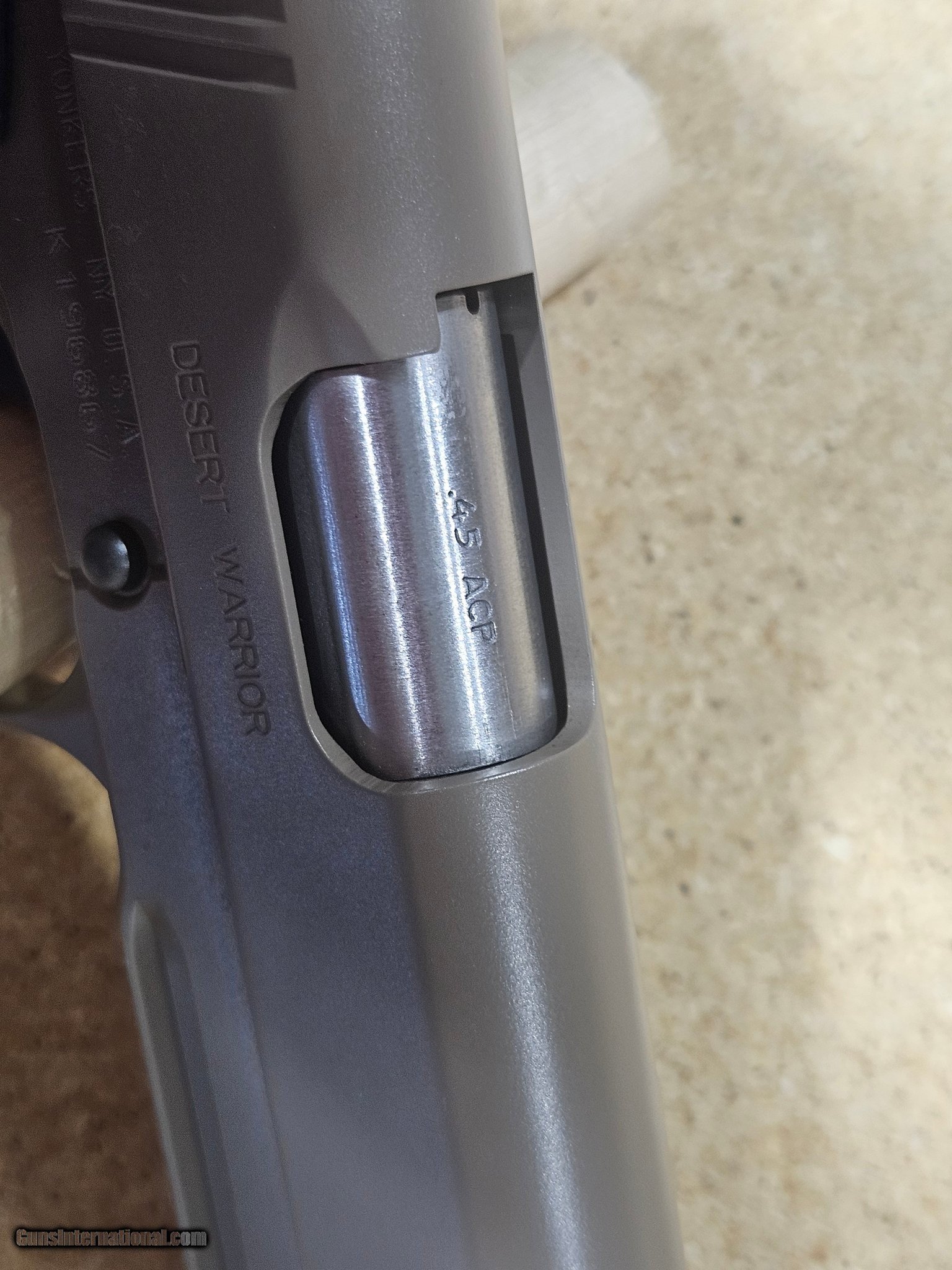 Description: Guns Listing ID: 580257 Very good condition Kimber Desert Warrior 1911 45acp with rail, nite sights, one 1911 magazine w/bumper, lanyard ring, black textured non original grips, ambidextrous safety, hollow hammer, high beavertail grip safety, and flared ejection port. SOLD Manufacturer: KIMBER Model: DESERT WARRIOR Caliber Info: .45 ACP Condition: Used - Non-Certified Barrels: 5" BARREL Action: SEMI AUTOMATIC Finish: desert tan |