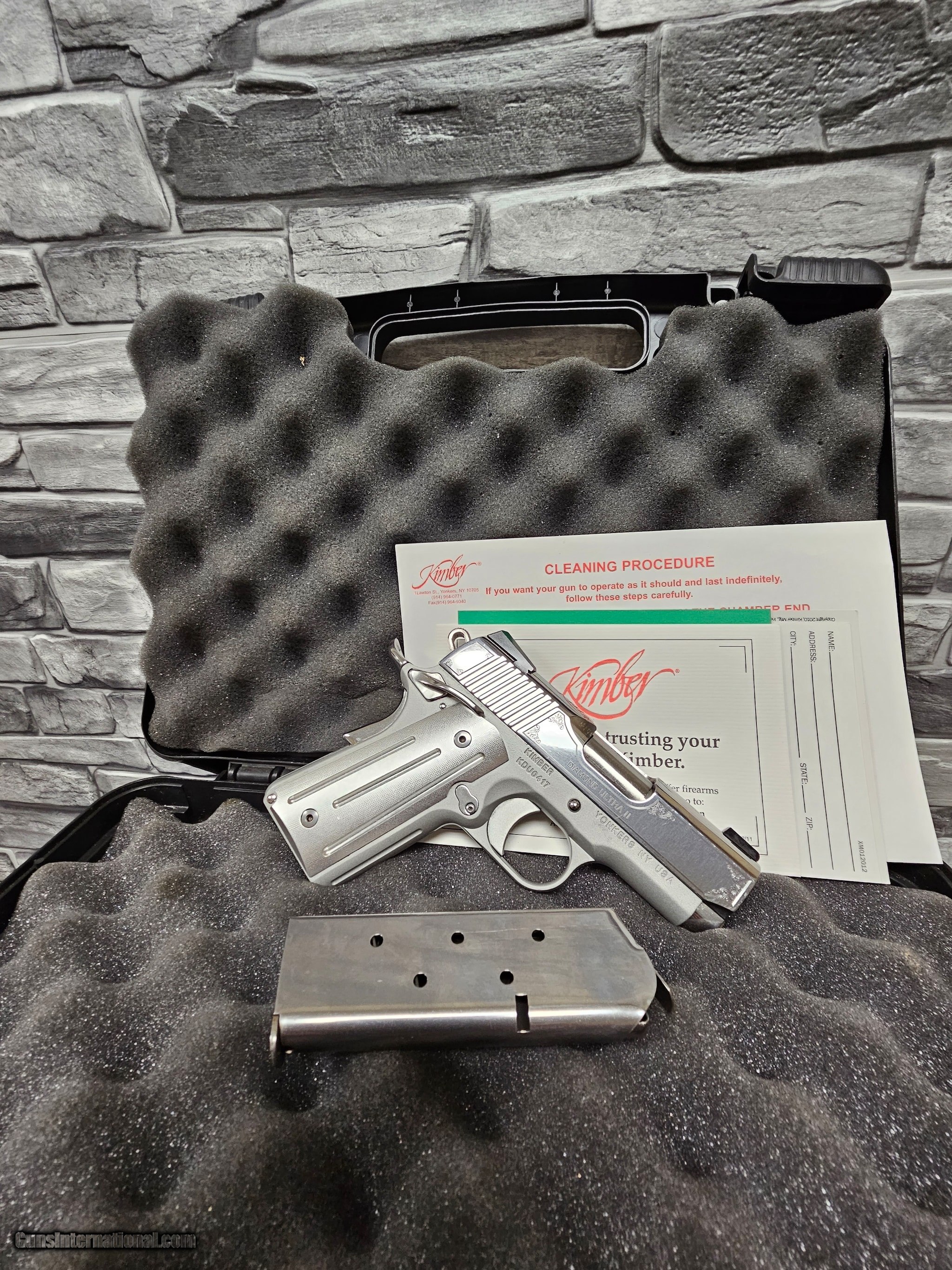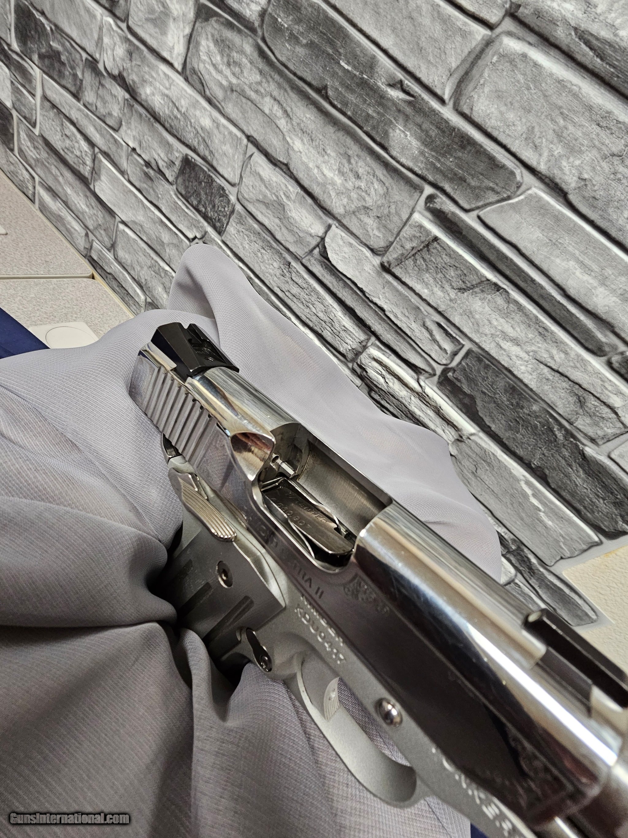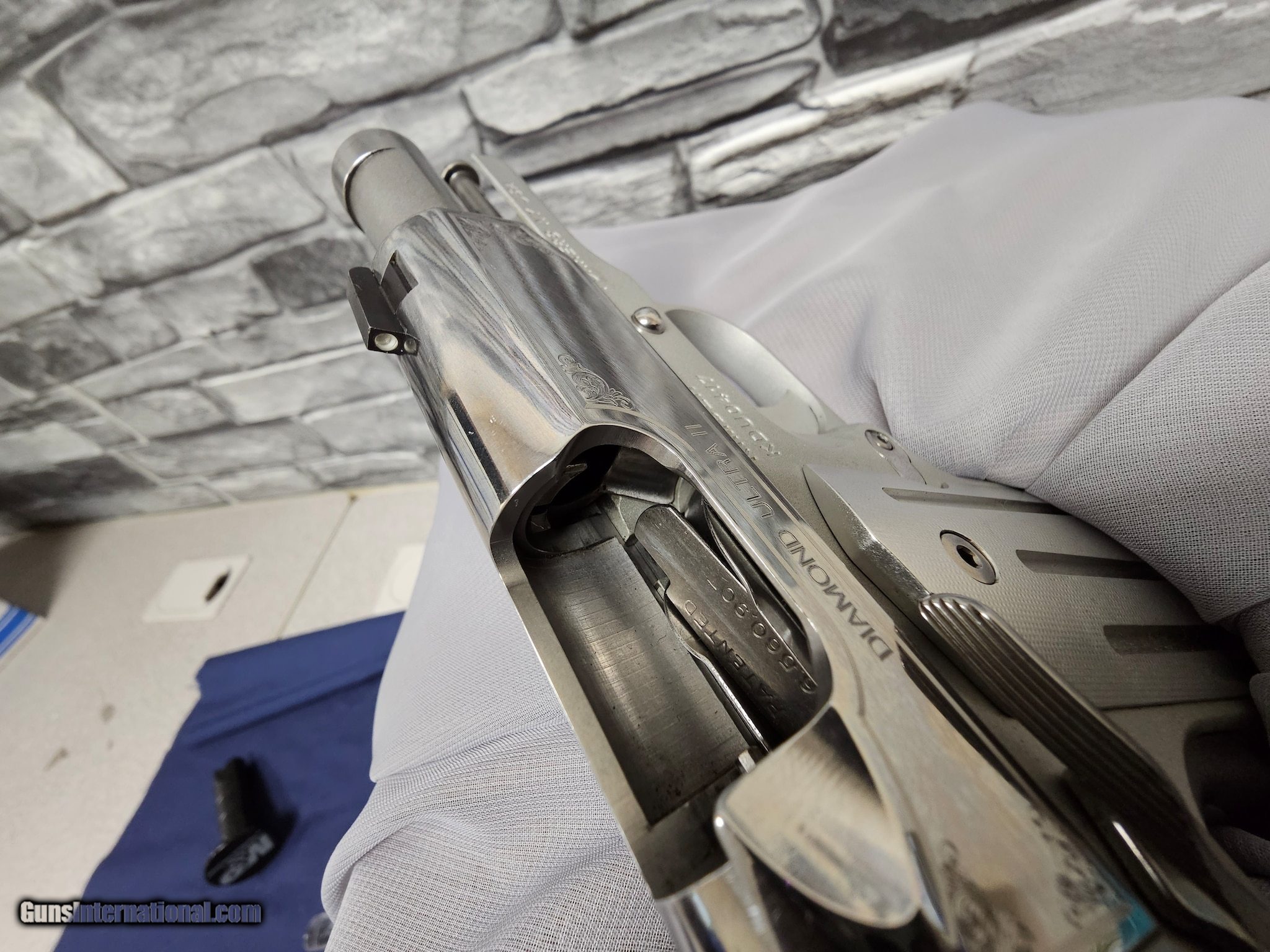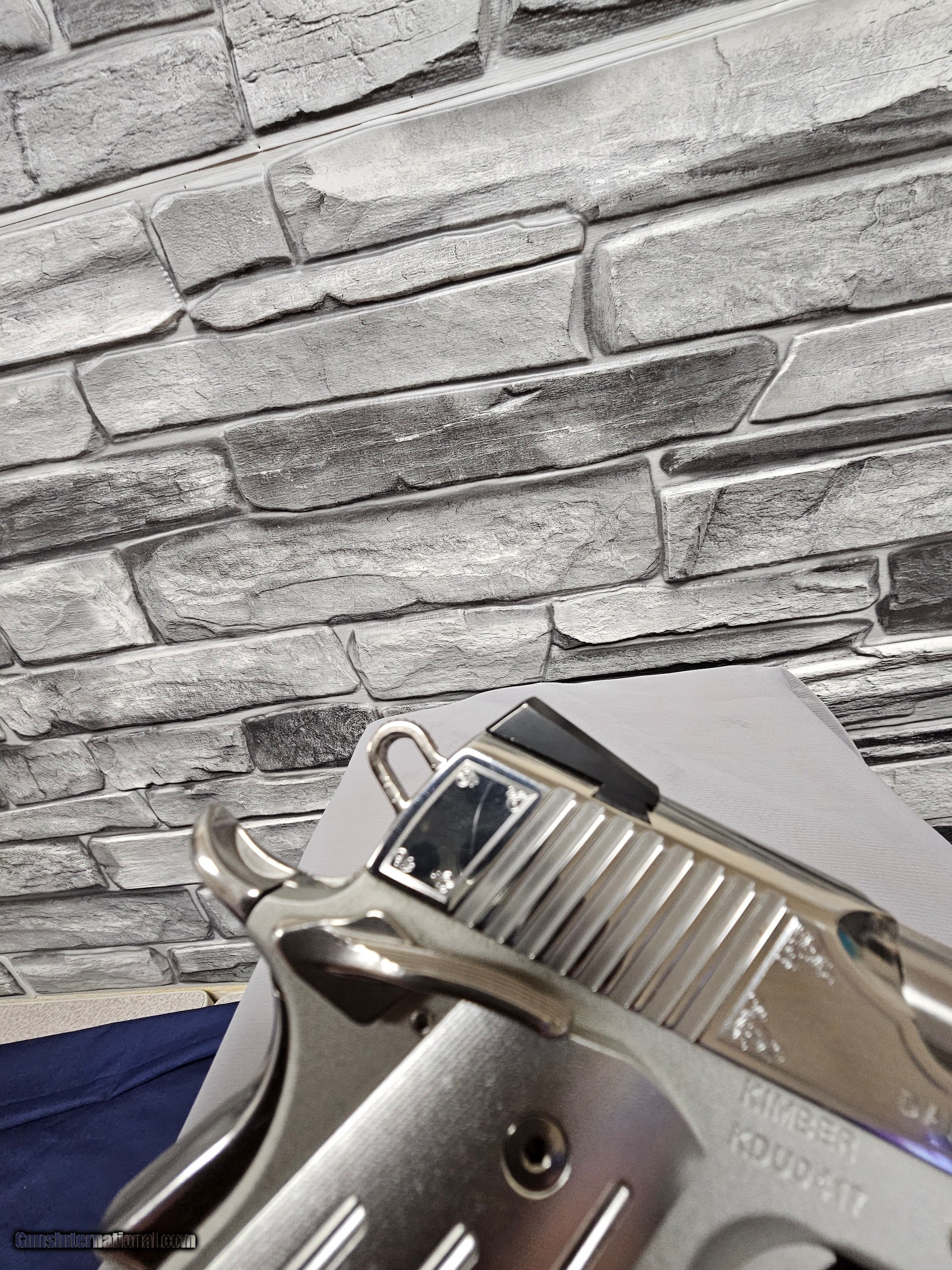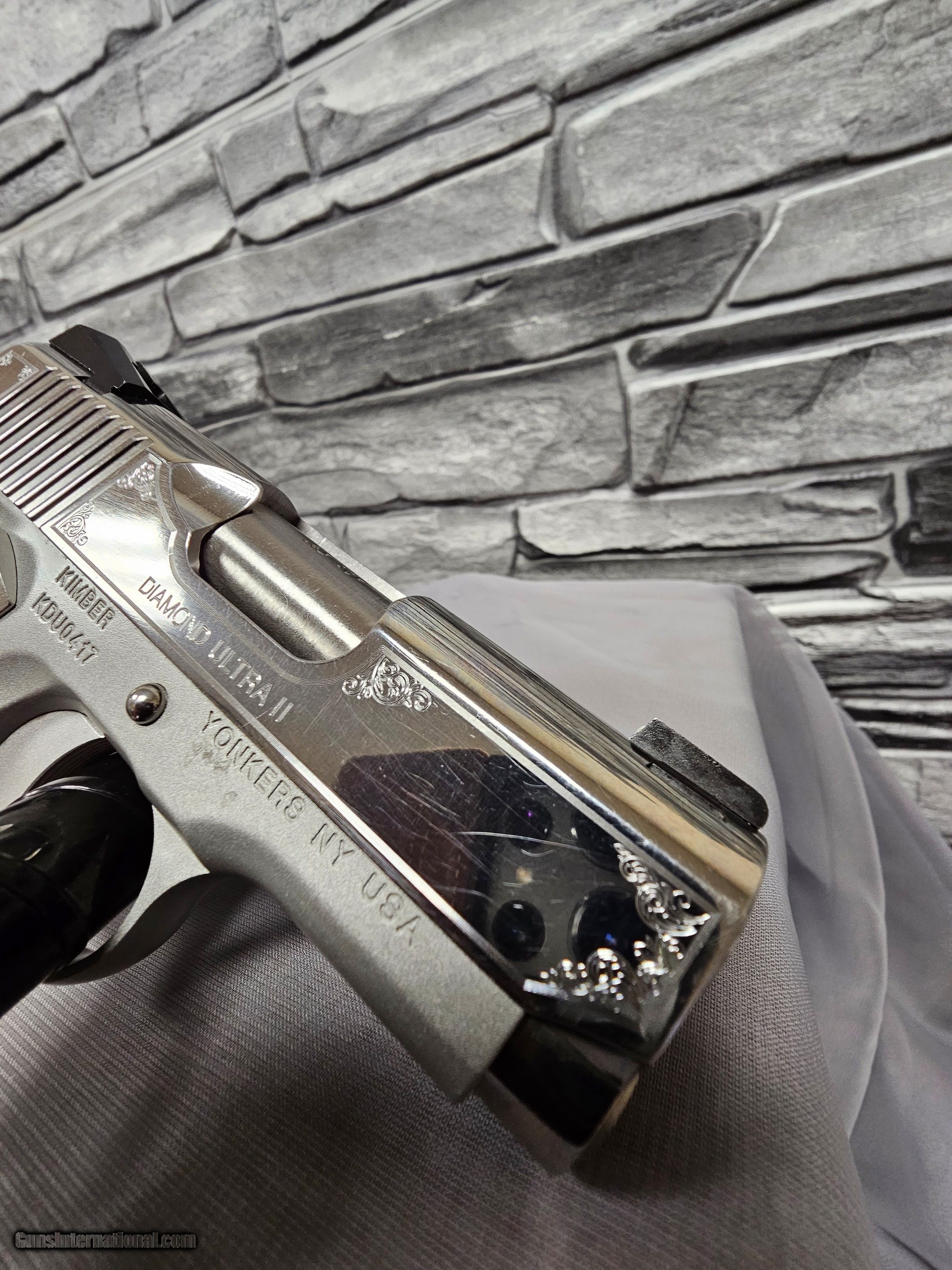 Description: Guns Listing ID: 849735 Rare find a Kimber Diamond Ultra II semi automatic pistol in .45 ACP.This Diamond Ultra II is in good condition and comes with the original hardcase, manual, 1ea 7 round magazine and night sights. The Diamond Ultra II features a mirror-polished slide and small parts, delicately engraved scroll accents and Special Edition markings on the slide, ambidextrous thumb safety, tritium night sights and aluminum ball-milled grips, several light scratches are seen on the slide. Bore is bright and shiny, very low round count but has been fired. Function tested on range. SOLD Manufacturer: KIMBER Model: DIAMOND ULTRA II Caliber Info: .45 ACP Condition: Used - Non-Certified Barrels: 3 BARREL Finish: SATIN SILVER |