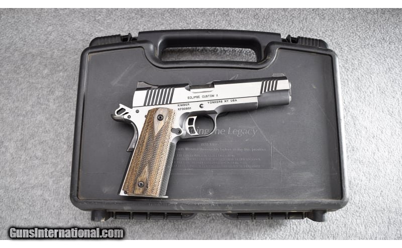 Description: This Kimber Eclipse Custom in 10mm Auto remains in very good to excellent condition. Some scratches and wear on the frame is visible. The pistol comes with the original factory Kimber box and one (1) factory magazine. Own a 1911 in the powerful 10mm cartridge. 10mm Auto SOLD Metal Condition: Very Good Wood Condition: Excellent Bore Condition: Excellent Barrels: 5 Triggers: Factory Butt Pad: Checkered Wood Two Panel Grips - Checkered Front Strap Weight: 38 oz Sights: Three Dot Nite Sights Item Location: Wheeling |