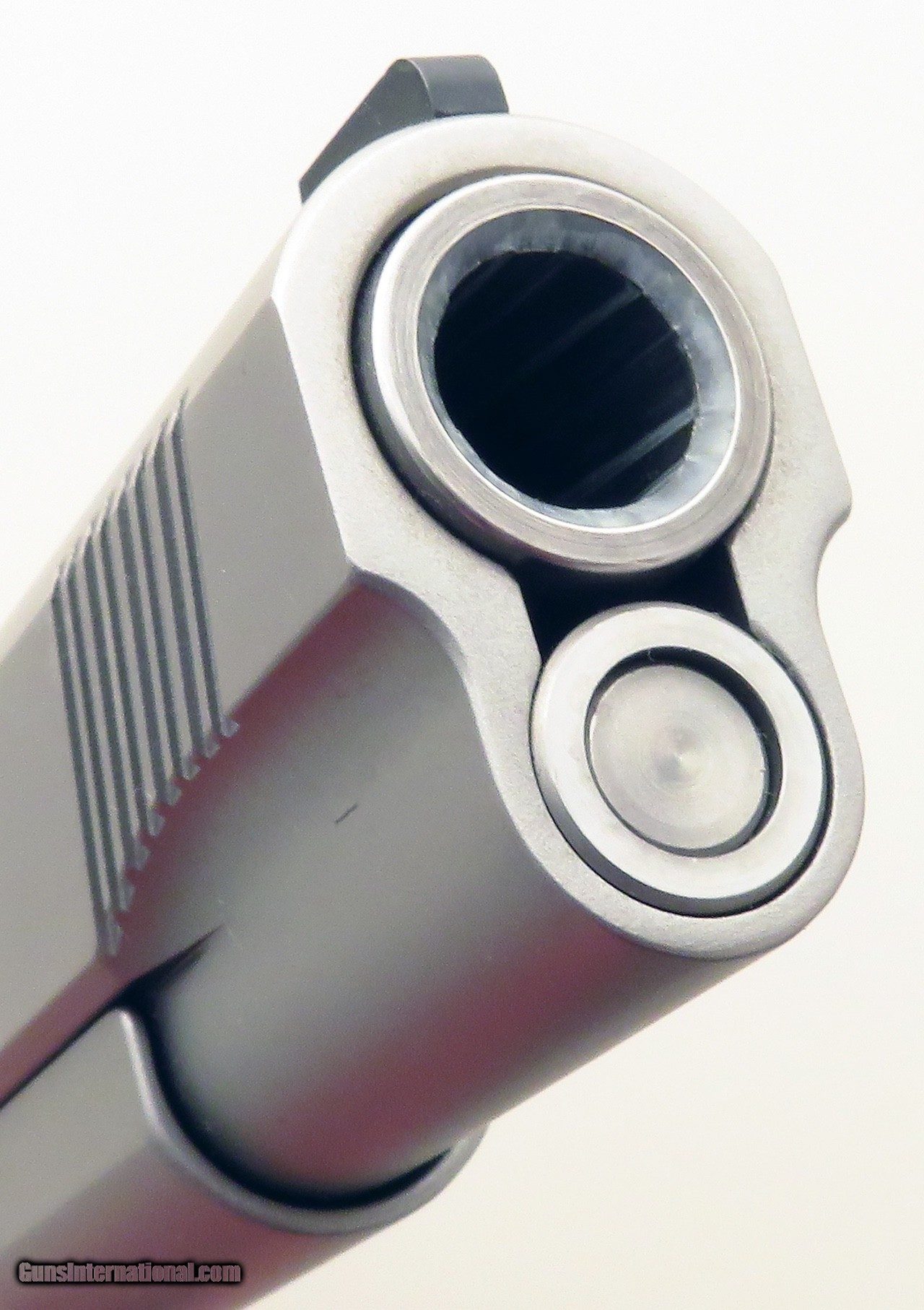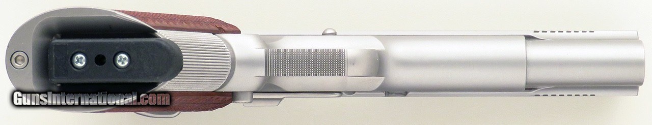 Description: Kimber Gold Combat Stainless II .45 ACP. Made in the Kimber Custom Shop and generally regarded as Kimber's best fighting/defense model, serial K297399 has a five-inch stainless steel bushingless match grade barrel. The flat top slide (serrated, French skirt) has Tactical Wedge night sights, front and rear serrations (narrow, beveled) and a satin finish. The stainless steel frame is rounded at the corners. Features include ambidextrous thumb safety (extended, bumped beavertail grip safety, match grade trigger, high cut-under trigger guard, checkering (under the guard, front strap, mainspring housing), beveled magazine well with detachable extension and Micarta grips. Two eight-round KimPro Tac-Mags with witness holes are included. CONDITION: A one-owner pistol known to be little fired, the bore is strong and bright. Metal finish is at least 98 percent with faint traces of tarnish on either side of the frame bevel at the mainspring housing. Grips are 100 percent. Night sight lamps have faded. No box or papers. The price is firm and layaway is available. $1,750 plus shipping, SOLD Handgun Caliber: .45 ACP (.45 Auto) |