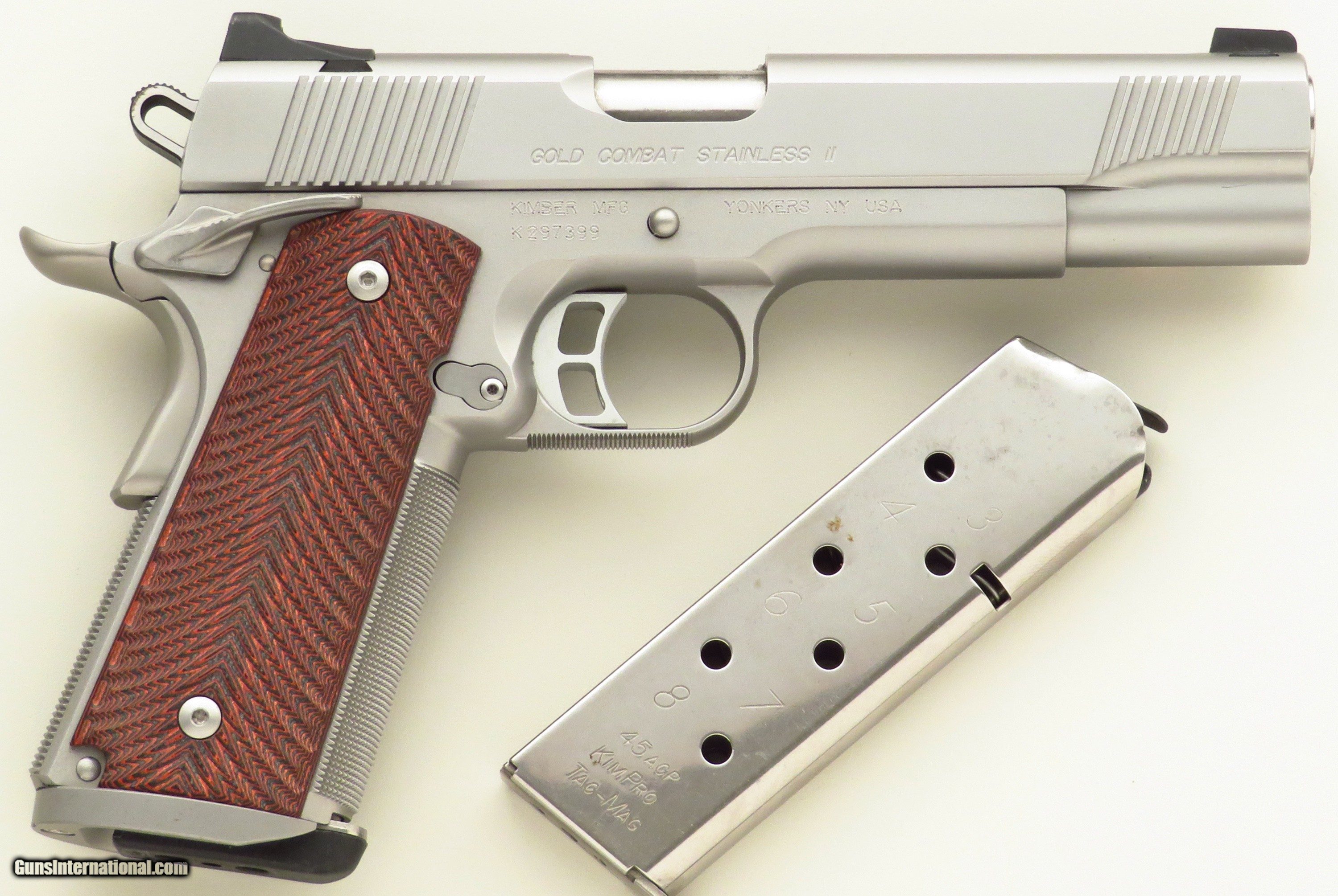 Kimber Gold Combat Stainless II .45 ACP, Custom Shop, stainless, flat top, French skirt, ambi safety, high cut, checkering, beveled, 98%, layaway
