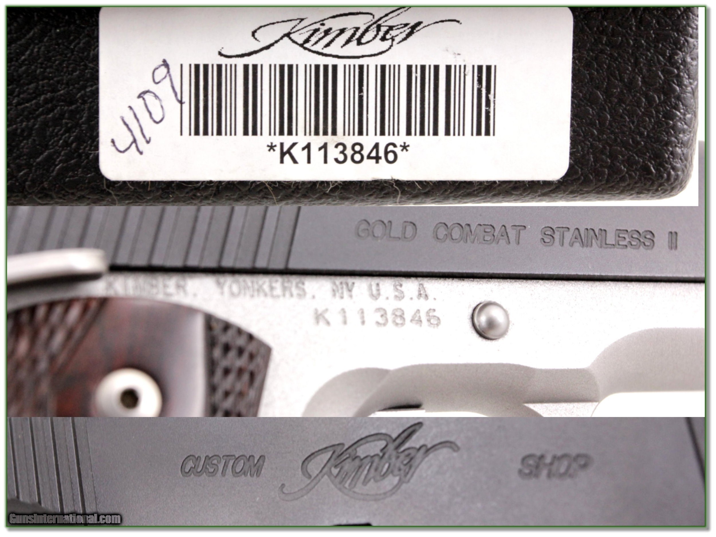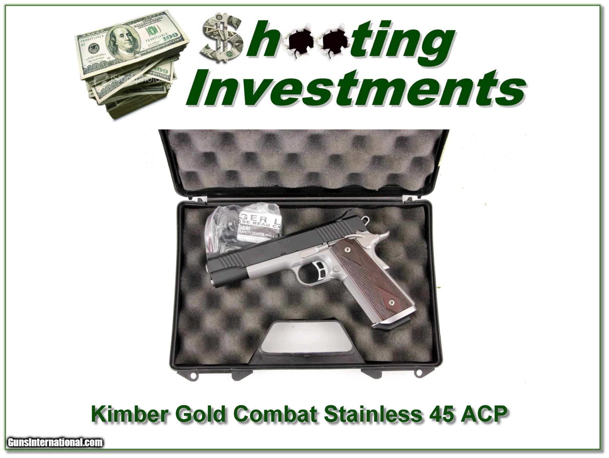 Description: This is a like new and hard to find 2-tone Kimber Gold Combat Stainless II in 45 ACP. These custom shop guns are no longer made. I am selling it for its owner who owned it many years and never fired it. If fired before him, not more than a few rounds. I see no marks anywhere. It comes with case as seen. I am selling this one on consignment and as such lay-a-way can’t be used. It does of course have the standard 3-day inspection. Shipping with insurance is $39. Please email me with any questions or larger pictures. (Consign your quality firearms with Shooting Investments for only 12%! Let me know if you have any you would like to sell!) 19-0188 Payment: Payment is by Money Order, Cashiers Check or Personal Check. I can now also accept Credit Cards (MasterCard, Visa, Discover & American Express) with a 3% convenience fee. PayPal can be used for some items but never for firearms. Shipping: The shipping charge will be listed in each description. It is $39 for most firearms. Some heavy guns or those insured for over $2000 will be higher. Shipments to Alaska and Hawaii are higher because air shipment is required. Most firearms are shipped on Tuesday and Thursday and usually in 5 days of receipt of payment. We package all shipments carefully and insure them. Optics are shipped Priority Mail and most other non-firearm shipments are shipped First Class. Returns: Our return policy is simple. If for any reason you are not pleased with your purchase, you may return your item for a full refund of purchase price. Ammunition cannot be returned. It is important to us that you are happy. Guns cannot be fired or dissembled before returning them and they must be returned in the same condition as received. Notification of a return must occur with-in 3 days of receipt at your dealer. Shipping, convenience and dealer fees are not refundable and are the responsibility of the buyer. Lay-a-way: If needed, we offer a 60 day lay-a-way option on most firearms. It is 1/3 now, 1/3 in 30 days and 1/3 in 60 days. Lay-a-way firearm sales are final and if not completed the first payment cannot be returned. Consigning your firearms with Shooting Investments: We will help you get top dollar for your firearms. While most local guns shops charge 20% or more, our fee is only 12% with a minimum of $75. At your local gun shop it might take months to sell. Selling on-line provides instant access to thousands of interested buyers. You won’t find any other on-line dealer willing to sell your firearms for only 12% or listing every gun on 3 separate s. Selling through an House typically costs the seller 15% and the buyer an addition 15% (so 30%) and you have to wait several months to sell and longer to receive funds. If properly priced, we will sell your firearms in a few weeks. Send us an email or give us a call and we’ll explain how easy it is for you to get top dollar. Trading: Trading for use is really just buying your gun to re-sell. If you have a gun you want to trade, please email a picture and we will let you know what we can give or it. You will always get more if we sell it for you on consignment. Help for California Buyers: We are happy to ship to California. It is the buyer’s responsibility to make sure any item you buy is legal in your state. We are also happy to help with your purchase of a firearm from someone other than us. If you see a gun you would like to buy but the seller can’t or won’t ship to California they can ship to use and we’ll then ship it to your California dealer. The cost for this service is only $30 + shipping. Let us know if we can help! SOLD |
