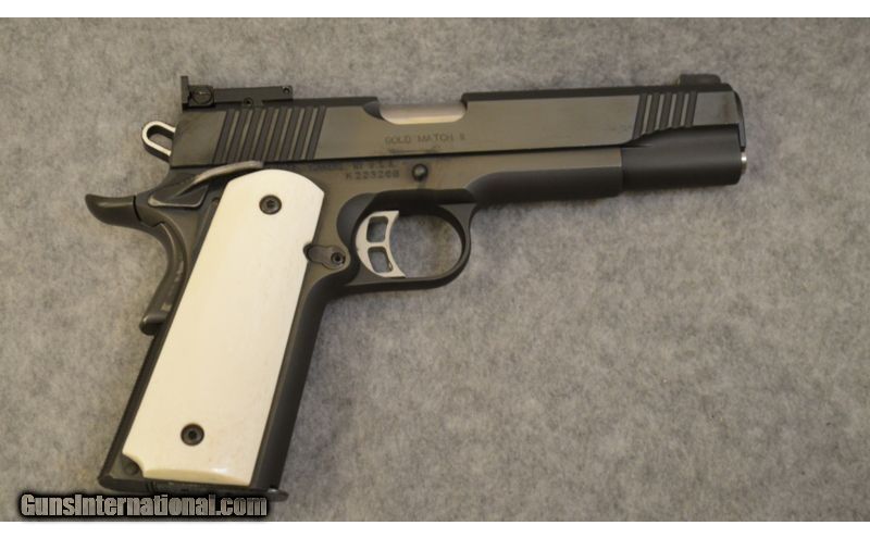 Description: This is a semi-automatic Kimber Gold Match II pistol chambered in .45 ACP. It has a 5" blued barrel with a blade sight and white pistol grips. The metal is in excellent condition, with minimal markings, and the bore is bright and shiny. This pistol comes with the factory case and two magazines. SOLD Caliber Info: .45 ACP Chambers: Semi-automatic Metal Condition: Excellent, with minimal markings. Bore Condition: Bright and shiny. Barrels: 5" Blued. Triggers: Single curved trigger. Stock: White pistol grips. Weight: 40 oz. Sights: Blade sight. Extras: Comes with factory case and two magazines. Item Location: Huntsville, AL |