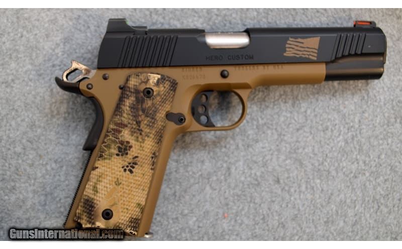 Description: The Kimber Hero Custom in .45 Auto is a premium 1911-style pistol designed for both tactical and civilian users, offering a blend of craftsmanship, reliability and aesthetics. This model features a 5" stainless steel match-grade barrel, delivering exceptional accuracy and performance. Its rugged design includes a custom finish with patriotic engravings, and G10 grips for enhanced control and durability. With a skeletonized trigger and hammer, it provides a crisp and consistent trigger pull. This pistol is in very good condition. .45 Auto SOLD Chambers: .45 Auto Barrels: 5 Triggers: Skeletonized Weight: 2.5 lbs. Sights: Factory Item Location: Louisville, KY |