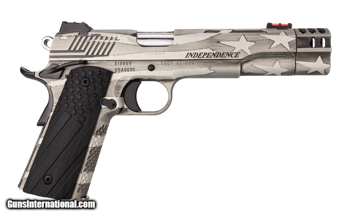 Description: Guns Listing ID: 1385352 The Kimber Independence is a premium 1911-style semi-auto pistol, designed for shooters who appreciate the classic 1911 platform combined with modern enhancements. Chambered in .45 ACP, this pistol features a 5\" barrel and an 8+1 capacity, offering reliable performance and precision. The Kimber Independence is finished with a striking American Flag Cerakote. This pistol is equipped with Hi-Viz adjustable sights, allowing for quick target acquisition and precise aiming. The 5\" barrel, combined with a 1-in-16\" twist rate, ensures consistent accuracy. The Raptor frame serrations provide an improved grip for easier slide manipulation, while the compensator helps to reduce muzzle rise, improving follow-up shot accuracy. Additionally, the Kimber Independence features a special serial number range, adding to its uniqueness and collectible value. SOLD Manufacturer: KIMBER Model: INDEPENDENCE Caliber Info: .45 ACP Condition: new Barrels: 5 BARREL Finish: AMERICAN FLAG |
