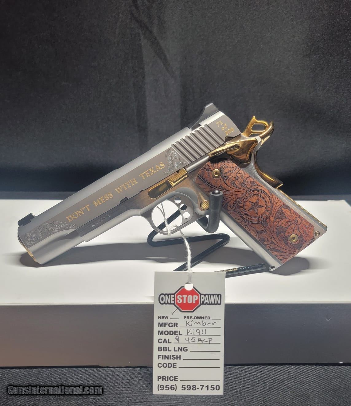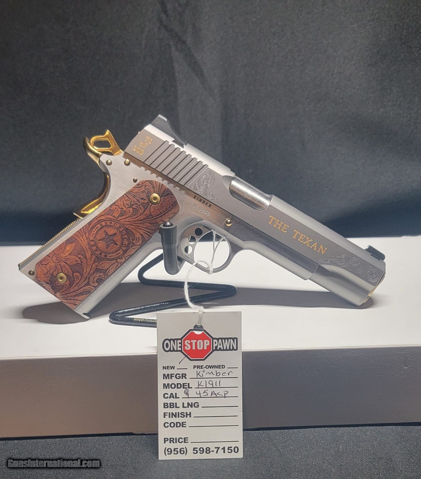 Description: Guns Listing ID: 482809 NEW!!! IN ORIGINAL BOX 1 MAG LIMITED EDITION THE TEXAN EDITION #71 OF 200 MADE HAS CERTIFICATE AND PAPERWORK IN BOX SOLD Manufacturer: KIMBER Model: K1911 Caliber Info: .45 ACP Condition: Used - Non-Certified Barrels: 5 BARREL Finish: stailess |