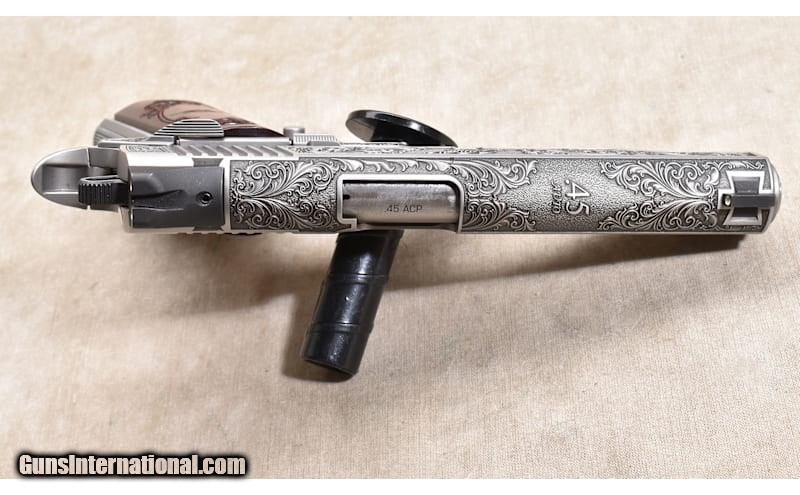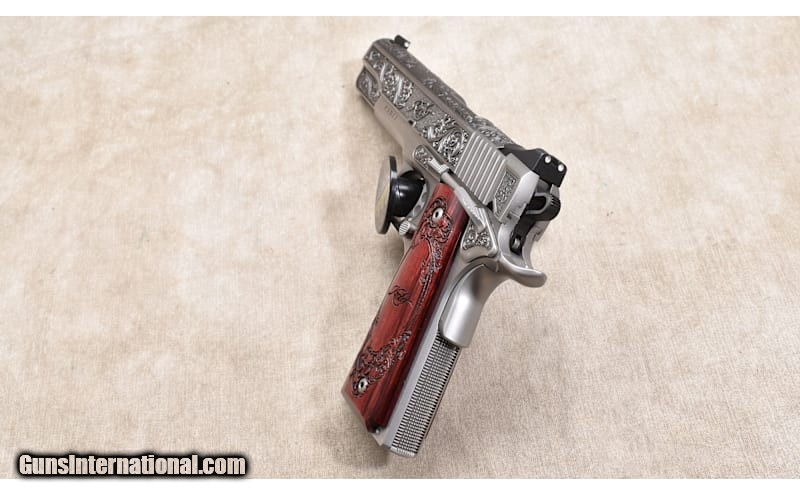 Description: This Limited Edition 1911 from Kimber features stainless steel construction, deeply engraved with Acanthus scroll work. This one is identified as Number 140 of the 200 made. It appears fired a bit but not much and could pass for new. .45 Auto Chambers: 8 + 1 capacity Metal Condition: LNIB. Wood Condition: LNIB. Bore Condition: LNIB. Barrels: 5 inches Triggers: Factory single action trigger. Butt Pad: "Walnut scales, laser-engraved with Acanthus scroll. Weight: 39 oz Sights: Low profile three-dot post and notch. Item Location: Rogers Price: $2,499.99 Contact Seller |