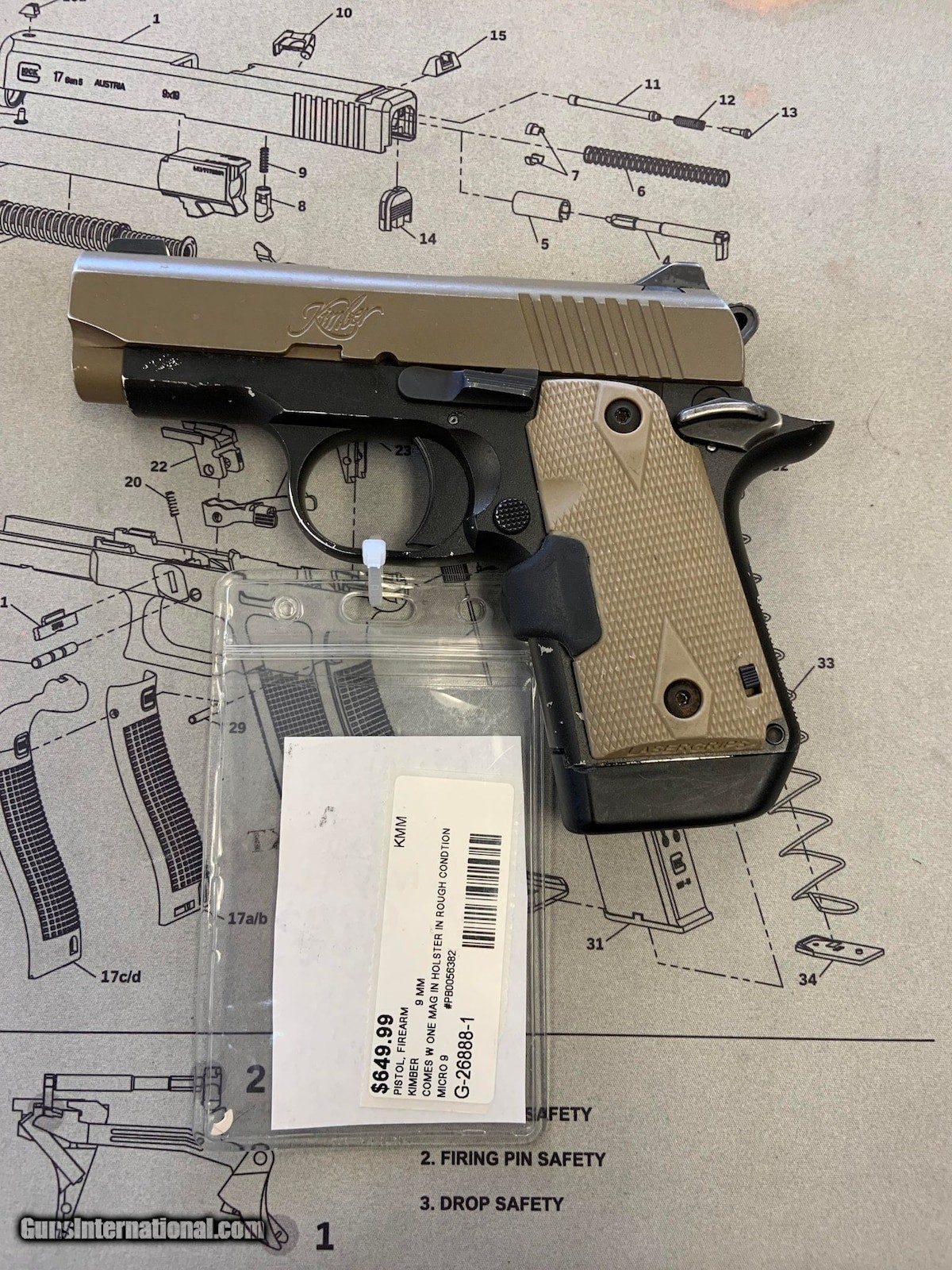 Description: Guns Listing ID: 828556 Pistol has visible marks and usage that can be seen. It has the laser grips with a working red dot laser. Only comes with the single magazine as shown in the photos. Rifling in barrel is still excellent! SOLD Manufacturer: KIMBER Model: Kimber Micro 9 Two-Tone Pistol 9mm Caliber Info: 9MM LUGER (9X19 PARA) Condition: Used - Non-Certified Barrels: 3.15 BARREL Finish: TAN AND BLACK |
