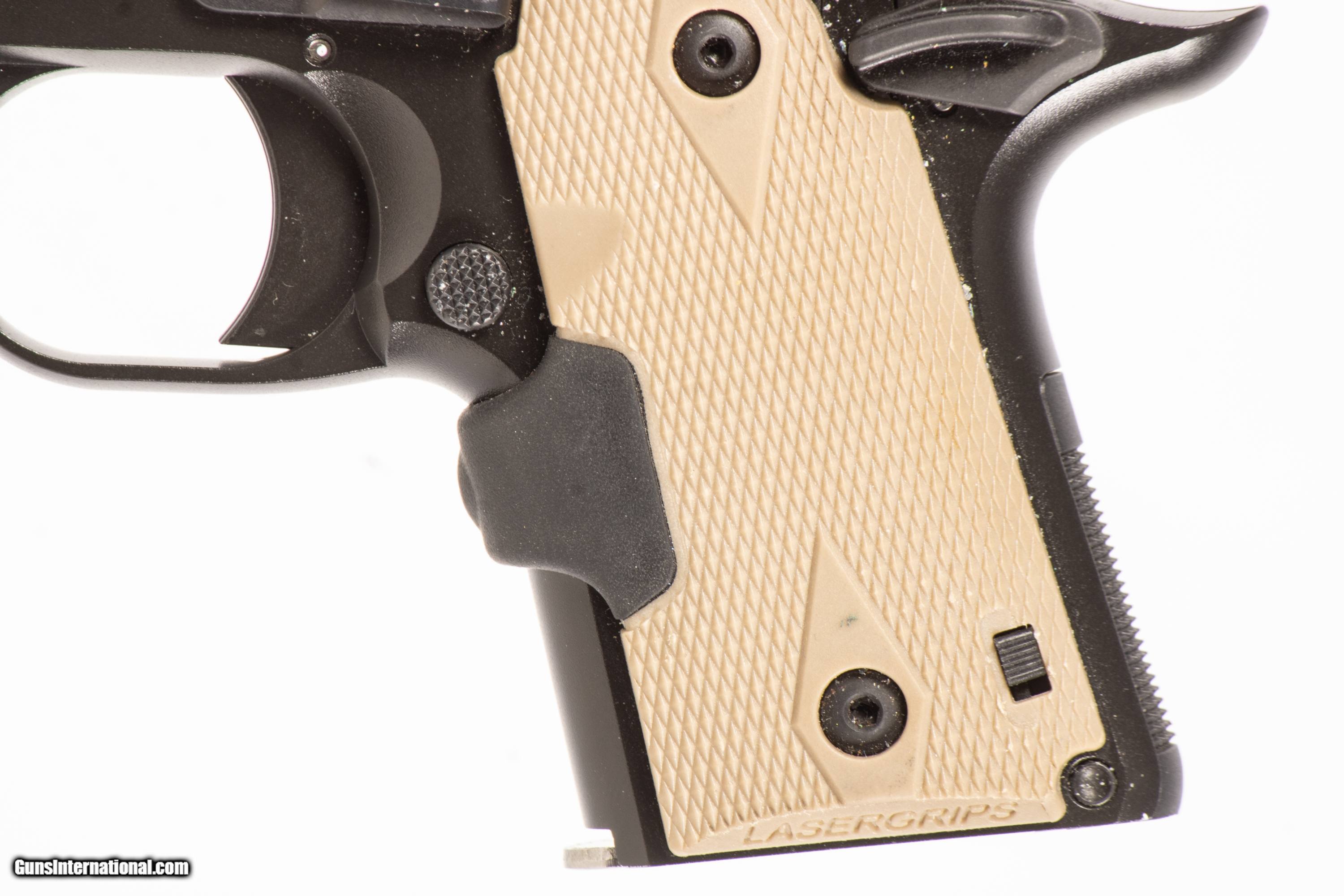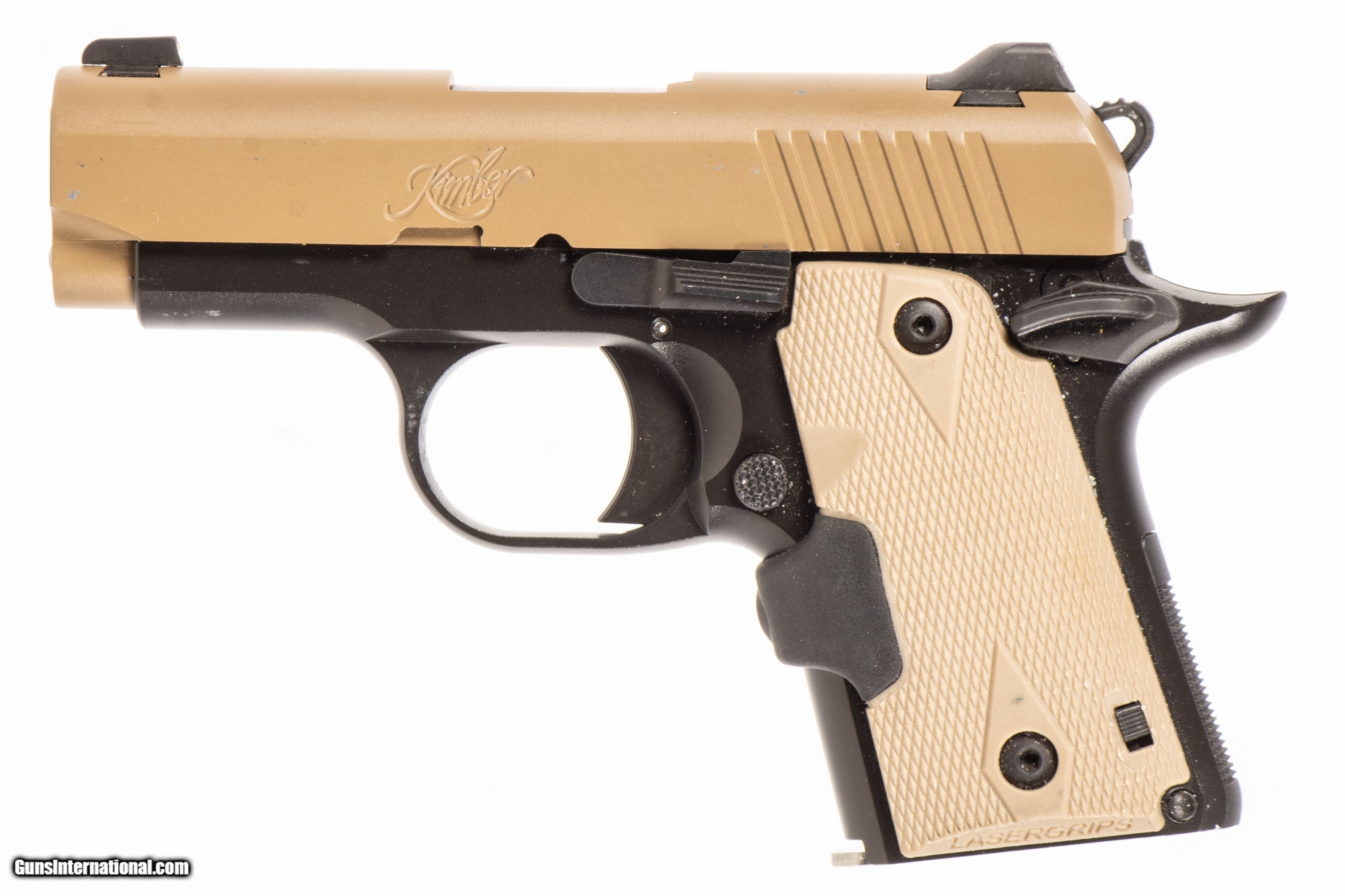 Kimber Micro 9 chambered in 9 mm with a 3 1/8 inch barrel bright & shiny bore desert tan coloring and Crimson Trace laser grip. This gun is in excellent condition and is covered by Dury's Lifetime Warranty.