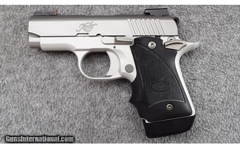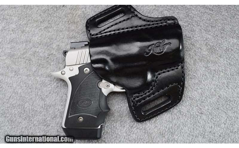 Description: This little Kimber remains in very good overall condition. Gun is very clean and shows little use. Complete with original cardboard box, Kimber carrying case, Mitch Rosen black leather holster and five total magazines. Very nice little gun! 9mm Luger SOLD Metal Condition: Very Good Bore Condition: Excellent Barrels: 3 Triggers: Factory Butt Pad: Checkered Black Rubber Kimber Grips Weight: 18 ozs. Sights: Orange Hi-Viz Front - Dual Green Hi-Viz Rear Sights Item Location: Wheeling |
