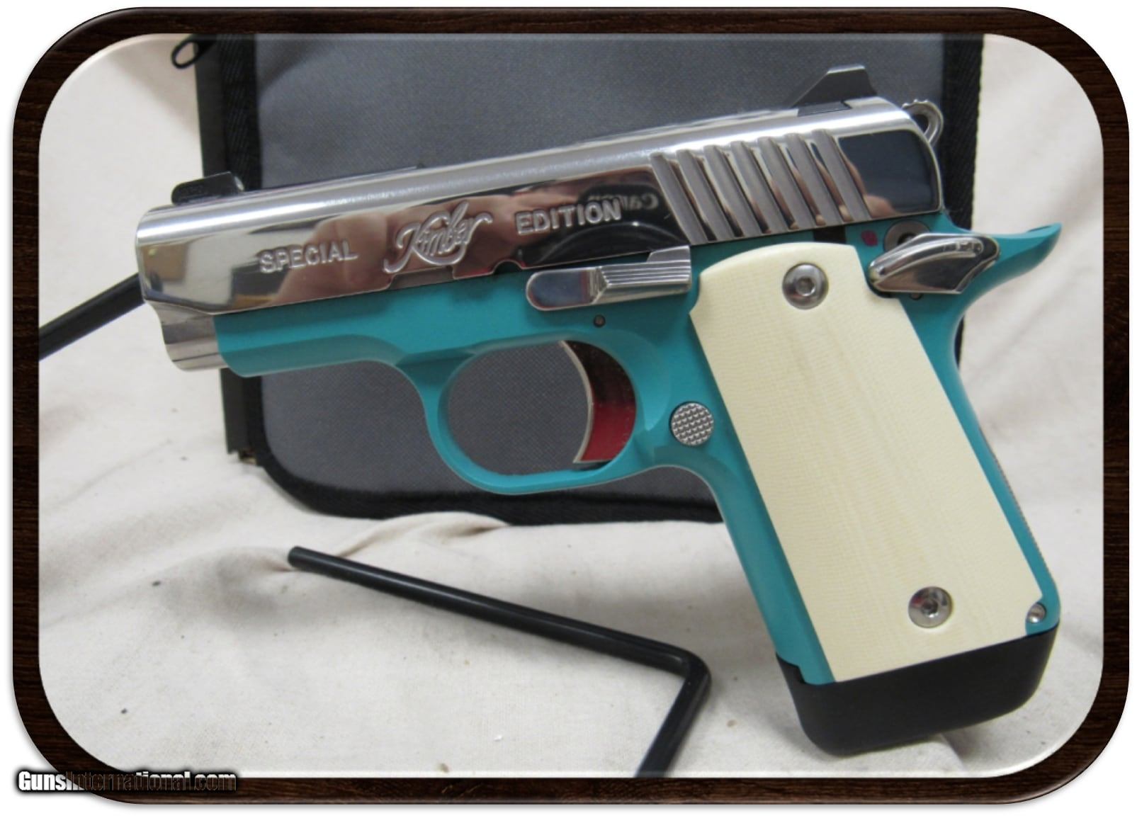 Description: Guns Listing ID: 882460 KIMBER MICRO 9 BEL AIR - 9MM - 6-ROUNDS - 3.15\" BARREL HAMMER-FIRED SINGLE-ACTION SEMI-AUTO PISTOL INCLUDES KIMBER BOX & SOFTCASE W/ OWNER‚‚S MANUAL + 3 MAGAZINES This Kimber Micro 9 is an easily concealed single-action semi-automatic pistol chambered in 9mm Luger. A 3.15 barrel is adorned with Kimbers traditional fixed low-profile sights to prevent any snags when drawing the Micro 9. This pistol weighs in at while under a pound making it a very comfortable personal carry choice. Styled after the Cheverolet Bel Air, this Kimber Micro 9 features a Bel Air Blue frame with Ivory grips and a polished stainless steel slide. Also included are low-profile night sights SOLD Manufacturer: KIMBER Model: MICRO 9 BEL AIR Caliber Info: 9MM LUGER (9X19 PARA) Condition: Used - Non-Certified Barrels: 3.15 BARREL Finish: BEL AIR BLUE |
