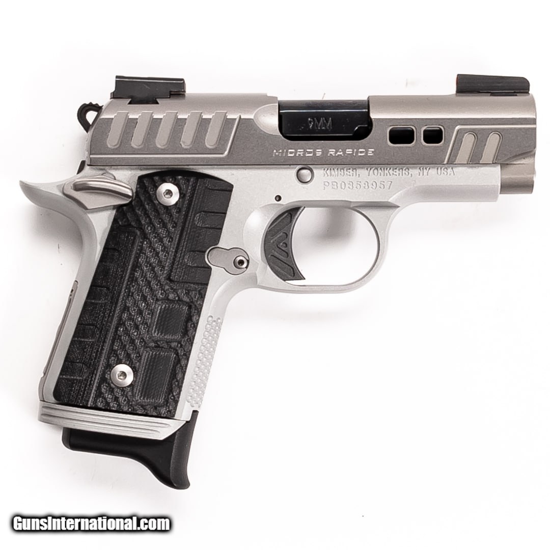 Description: Guns Listing ID: 292791 The Kimber Micro 9 Rapide (Black Ice) features performance-enhancing features, such as stepped cocking serrations, slide lightening cuts for faster lock time, and a striking two-tone KimPro finish and DLC coated barrel for extreme durability. The Stiplex front strap pattern also aids in a positive grip. This Micro 9 is equipped with AmeriGlo Hi-Viz night sights and is in excellent condition! Purchase includes a Kimber soft case, box, and two 7-round magazines. SOLD Manufacturer: KIMBER Model: MICRO 9 RAPIDE Caliber Info: 9MM LUGER (9X19 PARA) Condition: Used - Certified Barrels: 32 BARREL Finish: STAINLESS |