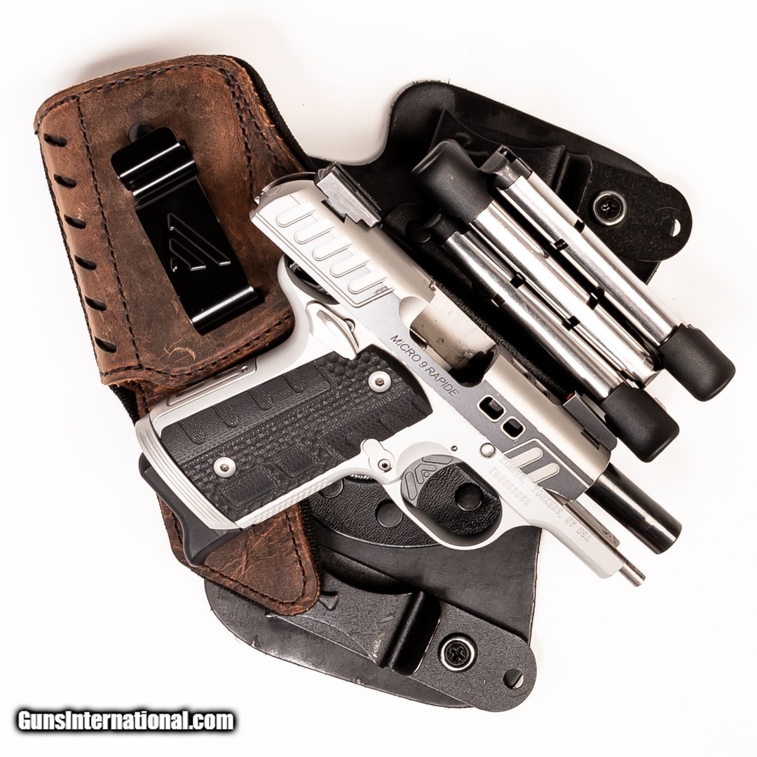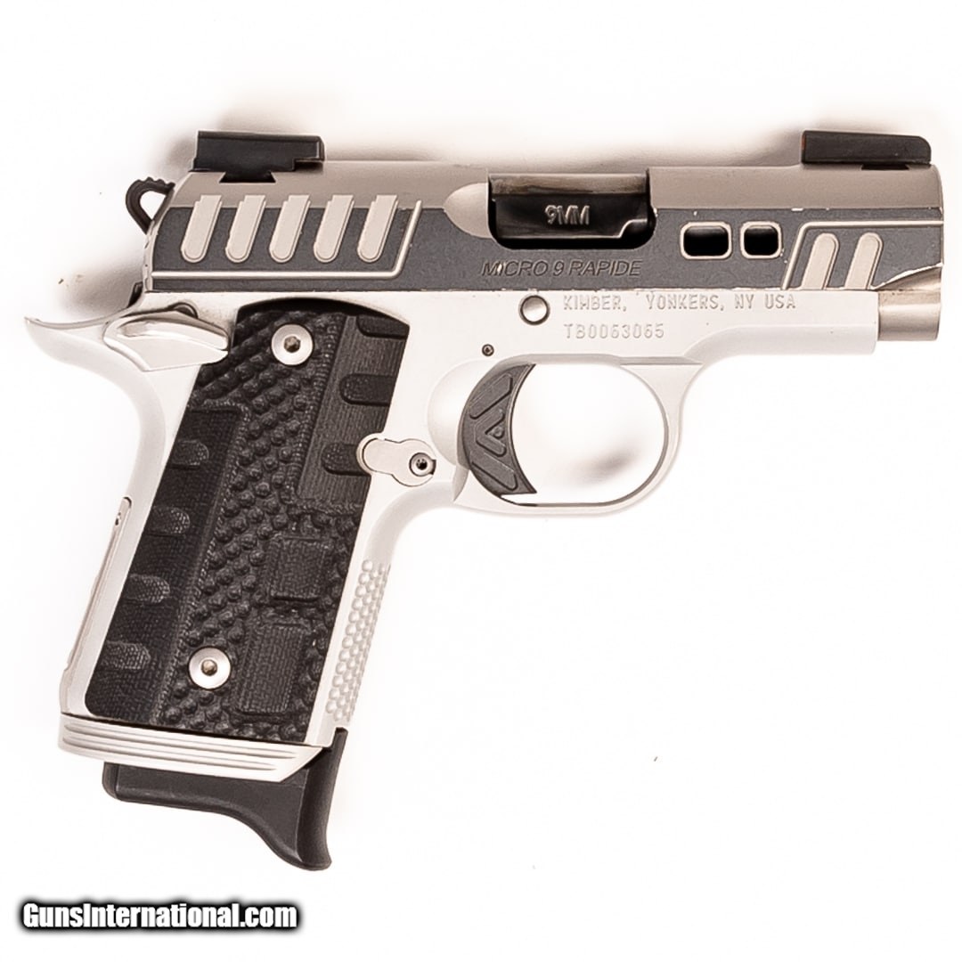 Description: Guns Listing ID: 502863 The Kimber Micro 9 Rapide offers rock-solid performance with style & class. It‚‚s a fantastic pistol for competition use, precision target shooting, and self-defense. This handgun includes four 7-round magazines, two right-handed IWB holsters, the orignal case with the manual SOLD Manufacturer: KIMBER Model: MICRO 9 RAPIDE Caliber Info: 9MM LUGER Condition: Used - Certified Barrels: 32 BARREL Finish: TWO-TONE STAINLESS |