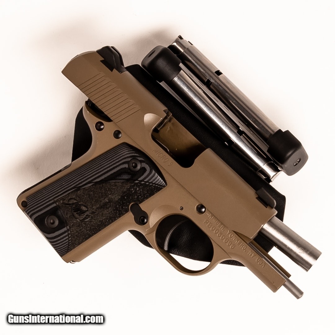 Description: Guns Listing ID: 635789 The Kimber Micro 9 is a durable 9mm handgun built on the 1911 platform. Known for their superior build quality and among the finest production pistols on the market, you can‚‚t go wrong with a Kimber. This Micro 9 includes the original box, soft case, manual, one 6-round magazine, two 7-round magazines, and a right-handed IWB We the People holster SOLD Manufacturer: KIMBER Model: MICRO 9 Caliber Info: 9MM LUGER (9X19 PARA) Condition: Used - Certified Barrels: 3.2 barrel Finish: FDE |