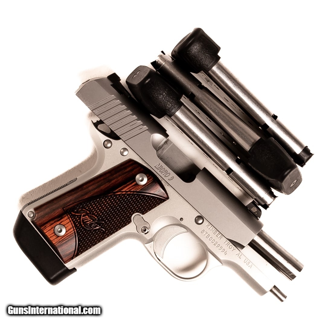 Description: Guns Listing ID: 685258 Micro slides are made to the tightest allowable tolerances, with barrels machined from stainless steel for superior resistance to moisture. All Micro frames are shaped from the finest aluminum for integrity and strength. In many respects a miniature 1911, among the most important Micro 9 design advantages is a single action trigger with the kind of short, smooth pull that ensures accuracy and builds confidence. The thumb safety, slide release and magazine release are pure 1911 as well. Standard features include a lowered and flared ejection port for flawless ejection and a beveled magazine well for fast, positive loading. Sights are steel – not plastic – and mounted in machined dovetails for additional integrity. The Kimber Micro 9 is a durable 9mm handgun built on the 1911 platform. Kimber’s are known for their superior build quality and are among the finest production pistols on the market. This handgun is customized and features front serrations and lightening cuts paired with a rose copper coated barrel. This handgun features two 6-round magazines, two 8-round magazines, and the original case with the manual. Get the best bang for your buck when you get a Certified Used Firearm . When you see the Certified Used stamp on any of our firearms, you can be confident that you’re getting exactly what you want – a gun only in very good to excellent condition and held to the highest quality standard. All Certified Used Guns come with a ‘no questions asked’ return policy . PLUS, ALL CERTIFIED USED GUNS SHIP FREE! SOLD Manufacturer: KIMBER Model: MICRO 9 Caliber Info: 9MM LUGER (9X19 PARA) Condition: Used - Certified Barrels: 3.2 barrel Finish: STAINLESS |