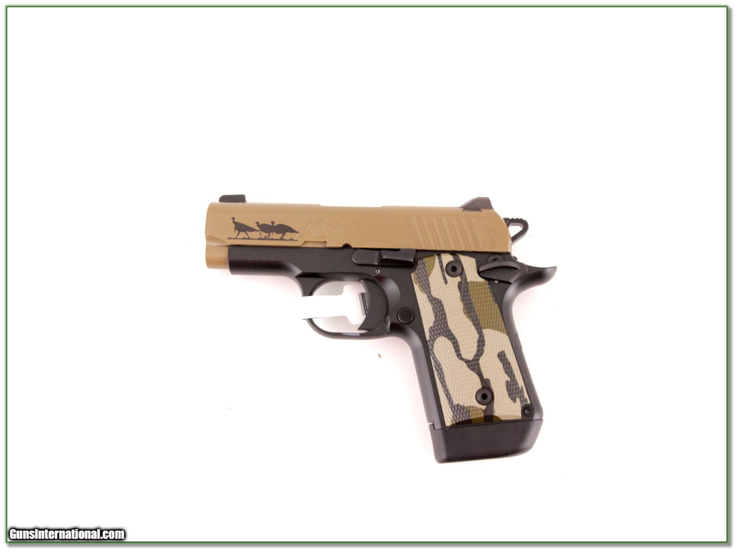 Description: This is a new, unfired and in the case with papers National Wild Turkey Federation Kimber Micro 9mm. It has camo grips with dark earth slide with turkeys on it. I am selling this one on consignment and as such lay-a-way can’t be used. It does of course have the standard 3-day inspection. Shipping with insurance is $39. Please email me with any questions or larger pictures. (Consign your quality firearms with Shooting Investments for only 12%! Let me know if you have any you would like to sell!) 19-1303 Payment: Payment is by Money Order, Cashiers Check or Personal Check. I can now also accept Credit Cards (MasterCard, Visa, Discover & American Express) with a 3% convenience fee. PayPal can be used for some items but never for firearms. Shipping: The shipping charge will be listed in each description. It is $39 for most firearms. Some heavy guns or those insured for over $2000 will be higher. Shipments to Alaska and Hawaii are higher because air shipment is required. Most firearms are shipped on Tuesday and Thursday and usually in 5 days of receipt of payment. We package all shipments carefully and insure them. Optics are shipped Priority Mail and most other non-firearm shipments are shipped First Class. Returns: Our return policy is simple. If for any reason you are not pleased with your purchase, you may return your item for a full refund of purchase price. Ammunition cannot be returned. It is important to us that you are happy. Guns cannot be fired or dissembled before returning them and they must be returned in the same condition as received. Notification of a return must occur with-in 3 days of receipt at your dealer. Shipping, convenience and dealer fees are not refundable and are the responsibility of the buyer. Lay-a-way: If needed, we offer a 60 day lay-a-way option on most firearms. It is 1/3 now, 1/3 in 30 days and 1/3 in 60 days. Lay-a-way firearm sales are final and if not completed the first payment cannot be returned. Consigning your firearms with Shooting Investments: We will help you get top dollar for your firearms. While most local guns shops charge 20% or more, our fee is only 12% with a minimum of $75. At your local gun shop it might take months to sell. Selling on-line provides instant access to thousands of interested buyers. You won’t find any other on-line dealer willing to sell your firearms for only 12% or listing every gun on 3 separate s. Selling through an House typically costs the seller 15% and the buyer an addition 15% (so 30%) and you have to wait several months to sell and longer to receive funds. If properly priced, we will sell your firearms in a few weeks. Send us an email or give us a call and we’ll explain how easy it is for you to get top dollar. Trading: Trading for use is really just buying your gun to re-sell. If you have a gun you want to trade, please email a picture and we will let you know what we can give or it. You will always get more if we sell it for you on consignment. Help for California Buyers: We are happy to ship to California. It is the buyer’s responsibility to make sure any item you buy is legal in your state. We are also happy to help with your purchase of a firearm from someone other than us. If you see a gun you would like to buy but the seller can’t or won’t ship to California they can ship to use and we’ll then ship it to your California dealer. The cost for this service is only $30 + shipping. Let us know if we can help! SOLD |