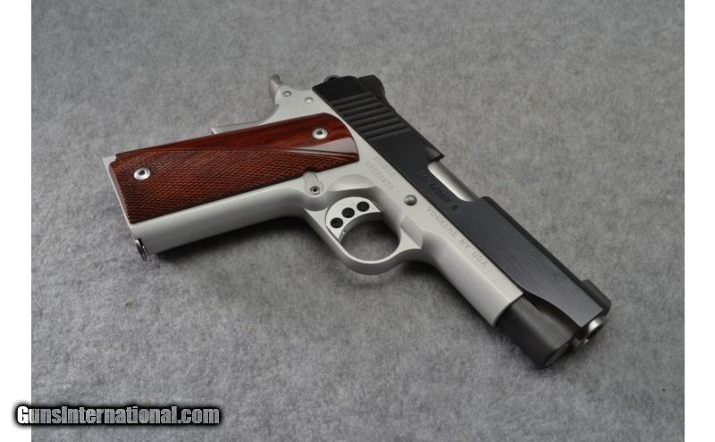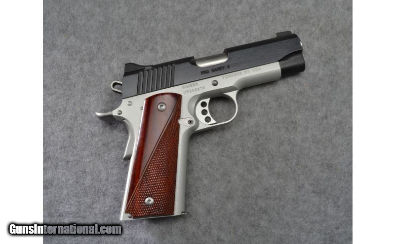 Description: A prevously owned, never fired, Kimber Pro Carry II semi auto pistol in .45 ACP. This pistol has a Matte Black slide with Satin Silver frame. It has a 4 inch barrel with 3 dot whitle night sights. It comes with one magazine and its original box in like new condition. SOLD Caliber Info: .45 ACP. Chambers: Semi auto 7 + 1. Metal Condition: Like new. Wood Condition: Like new. Bore Condition: Like new. Barrels: 4 inch. Triggers: Single - stainless steel. Stock: Kinber checkered Rosewood grips. Weight: 28 Ozs. Sights: 3 Dot white fixed sights on the slide. Extras: Factory box and 1 magazine total. Item Location: Woodbury, MN |