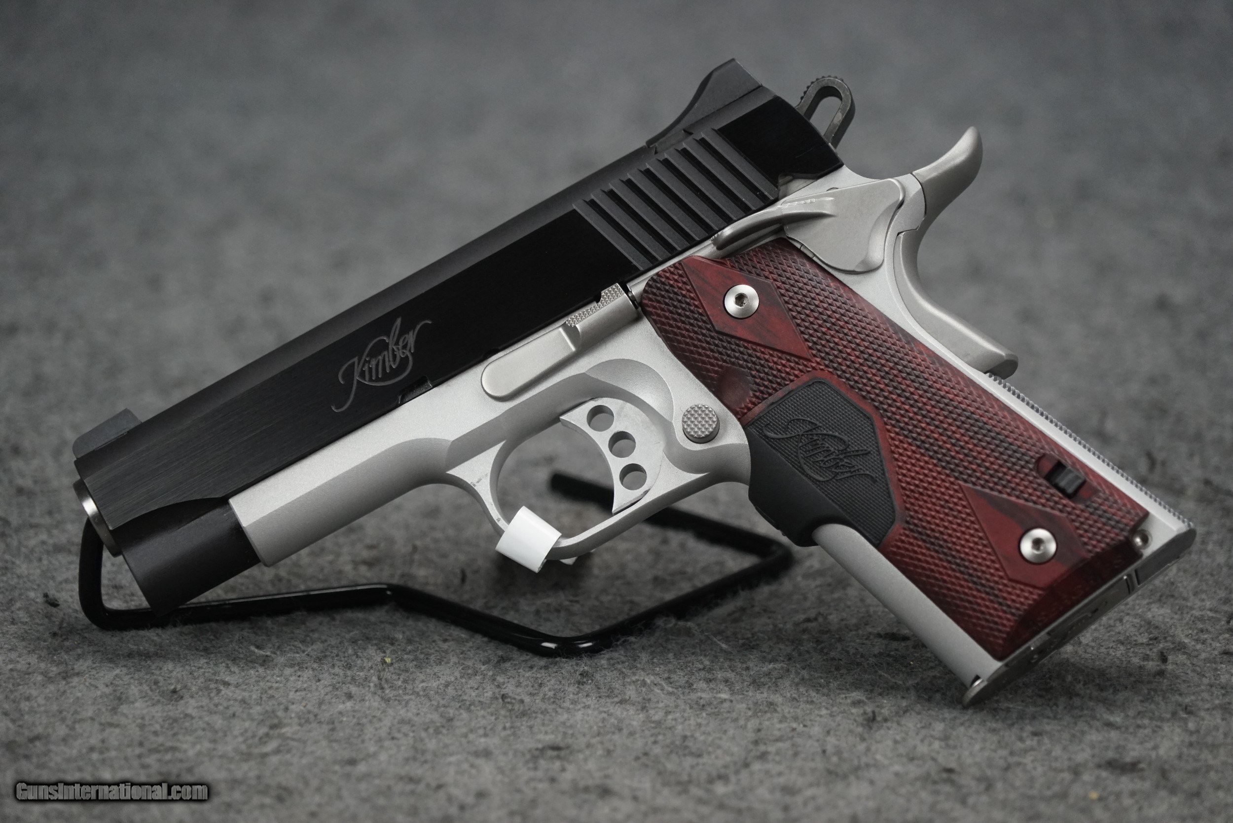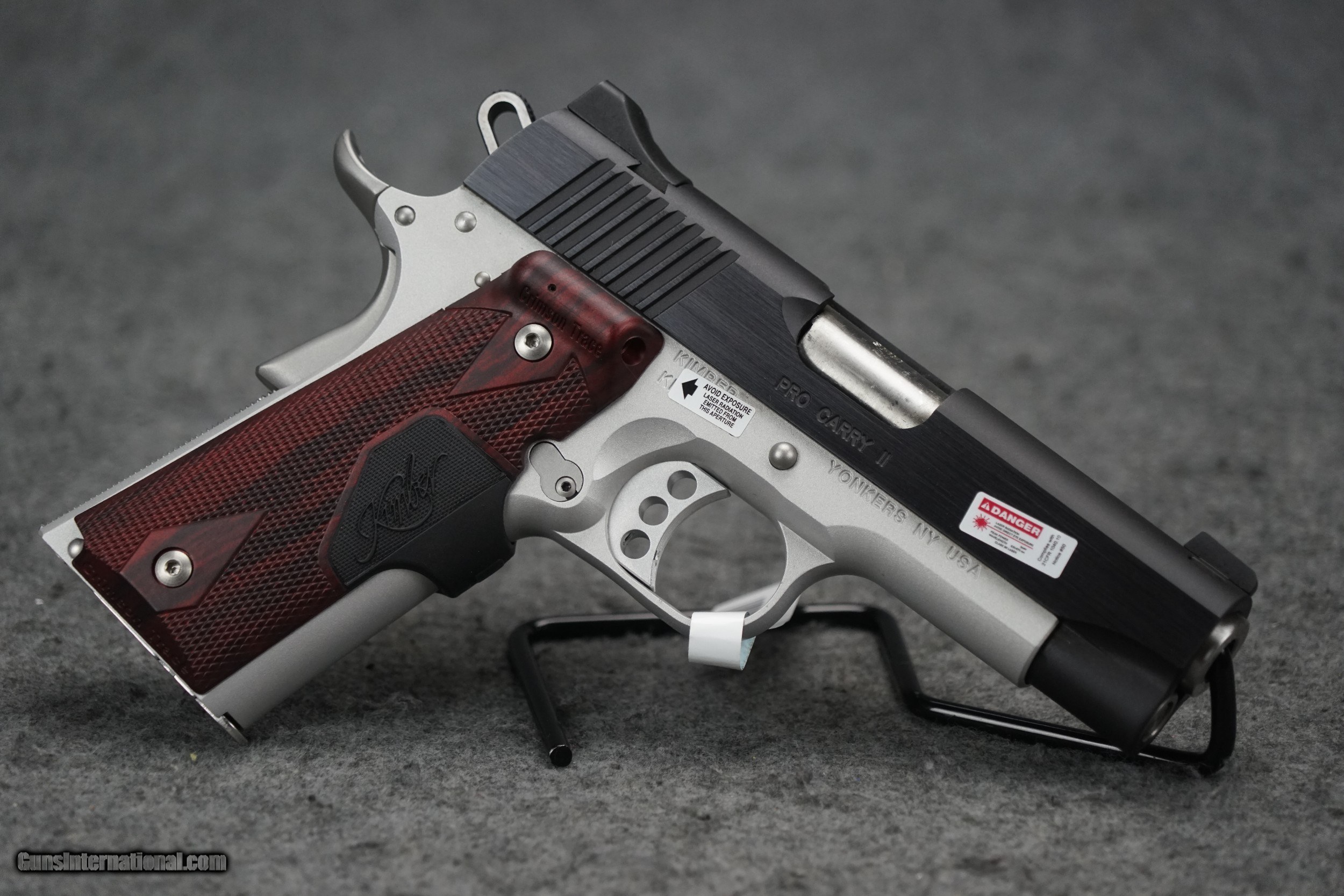 Description: Ideal for law enforcement, home defense, or concealed carry, Kimber Pro Carry II pistol combines Kimber quality with a lightweight aluminum frame and full-length grip for maximum control while shooting. A lightweight pistol ideal for carrying 24/7, this 1911-style handgun is built around a lightweight aluminum frame machined on the same computer-driven machines and to the same unequaled tolerances as Kimber steel frames. The Pro Carry II's steel slide and match grade steel 4'' bushingless bull barrel aids concealability while still delivering Kimber accuracy. Full-length guide rod. Fixed low profile sights. Synthetic grips. Extended thumb safety and beavertail grip safety for fast positive action. Features: Lightweight aluminum frame Match-grade barrel Fixed, low profile sights Beavertail grip safety Smooth/checkered rosewood grips Caliber: 9mm Weight: 28 oz. Action: Single Action Only Semi-Automatic Safety: 1911 Style Sights: Fixed Low Profile Sights Laser Grips Magazine Capacity: 7 Grips: Smooth/Checkered Rosewood w/ Laser Slide Finish: Matte black Brush-Polished Frame Finish: Satin Silver Barrel Length: 4" SOLD Handgun Caliber: 9x19mm Parabellum (9mm Luger, 9x19mm NATO) Manufacturer: Kimber Model: Pro Carry II Barrel Length: 4" Barrel Condition: BRAND NEW |