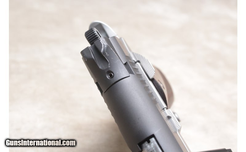 Description: 9mm Luger SOLD Metal Condition: Metal is in good condition with some minor scratches and wear Wood Condition: Checkered rosewood grips Bore Condition: Bore is in excellent condition with some wear Barrels: 4" stainless steel match grade barrel Triggers: "Aluminum, three hole standard factory trigger Weight: 28 ounces Sights: Fixed low profile sights Item Location: Pearl, MS |