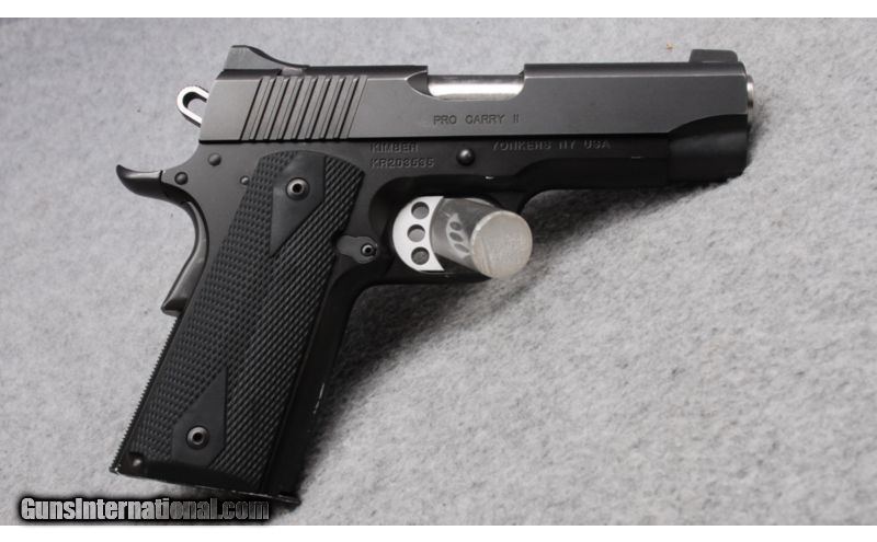 Description: This is a Kimber Pro Carry II pistol in .45 ACP. It has a 4 inch match grade barrel and a full length grip, an aluminum match grade trigger, a full length guide rod, fixed low profile sights, and checkered black synthetic double-diamond grips. Condtion is Excellent overall with some wear on the edges of the frame and slide along with a small patch of blue wear on the front strap. The bore is bright and shiny, and a case is included. SOLD Caliber Info: .45 ACP Metal Condition: Excellent Bore Condition: Bright and Shiny Barrels: 4" Match Grade Triggers: Aluminum, Match Grade Stock: Black Synthetic, Double-Diamond Checkering Grips Sights: Fixed Low Profile Extras: Comes with a case Item Location: Reno, NV |