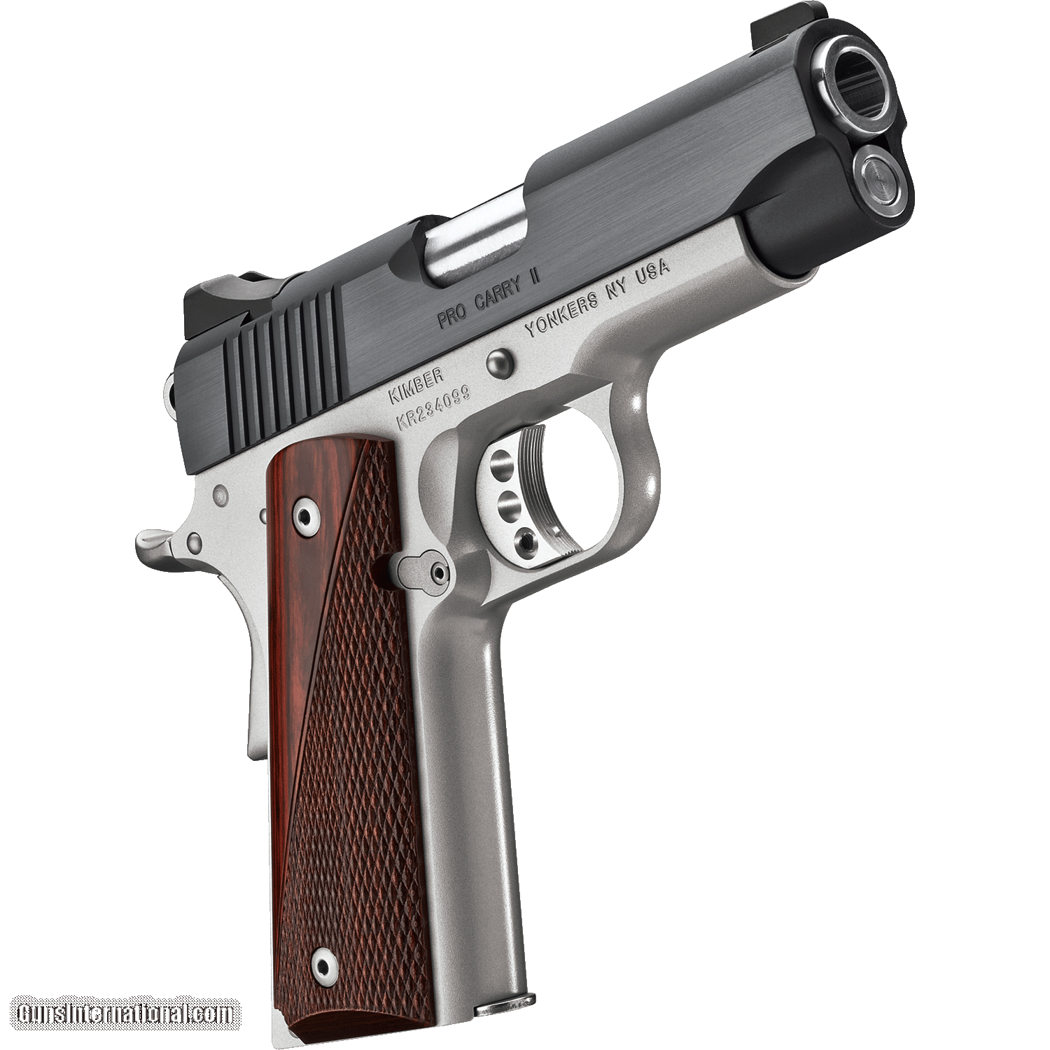 Description: Guns Listing ID: 346376 The Kimber Pro Carry II is a family of handsome 1911 semi-automatic pistols. Each pistol in this series has a 4” match grade barrel is adorned with a low profile fixed rear sight. The aluminum alloy frame keeps the Pro Carry II’s unloaded weight down to 1.75 pounds, making it a very usable carry weapon. Both the hammer and the trigger are skeletonized, with the latter also being of match grade quality. The mainspring housing of Pro Carry II pistols is checkered to work in concert with the checkered grips, available in rosewood or polymer, to provide users a firm grasp on these 1911s whenever they are most needed. This model features an attractive two-tone finish, 4\" barrel, and is chambered in .45 ACP with a 7 + 1 capacity. SOLD Manufacturer: KIMBER Model: PRO CARRY II Caliber Info: 45 ACP Condition: new Barrels: 4 BARREL |