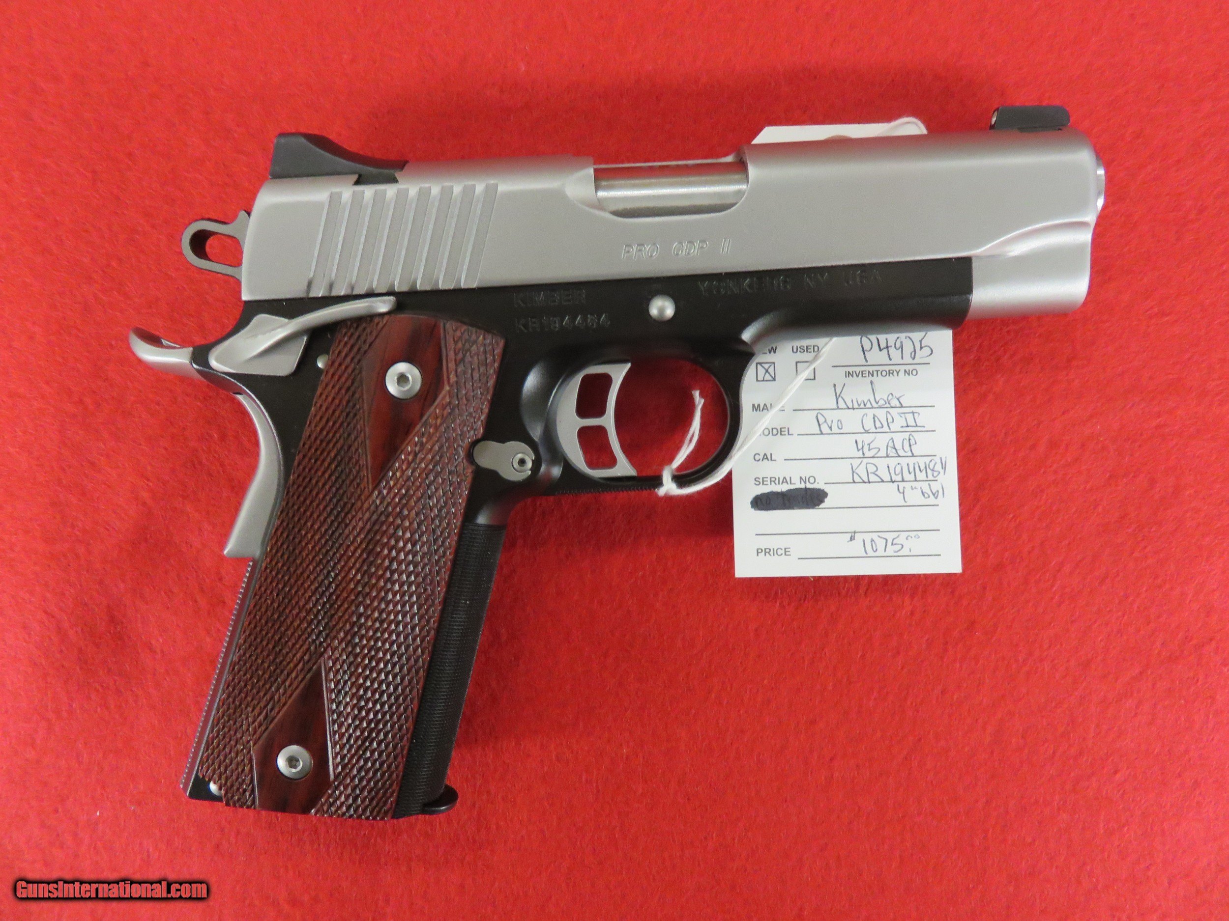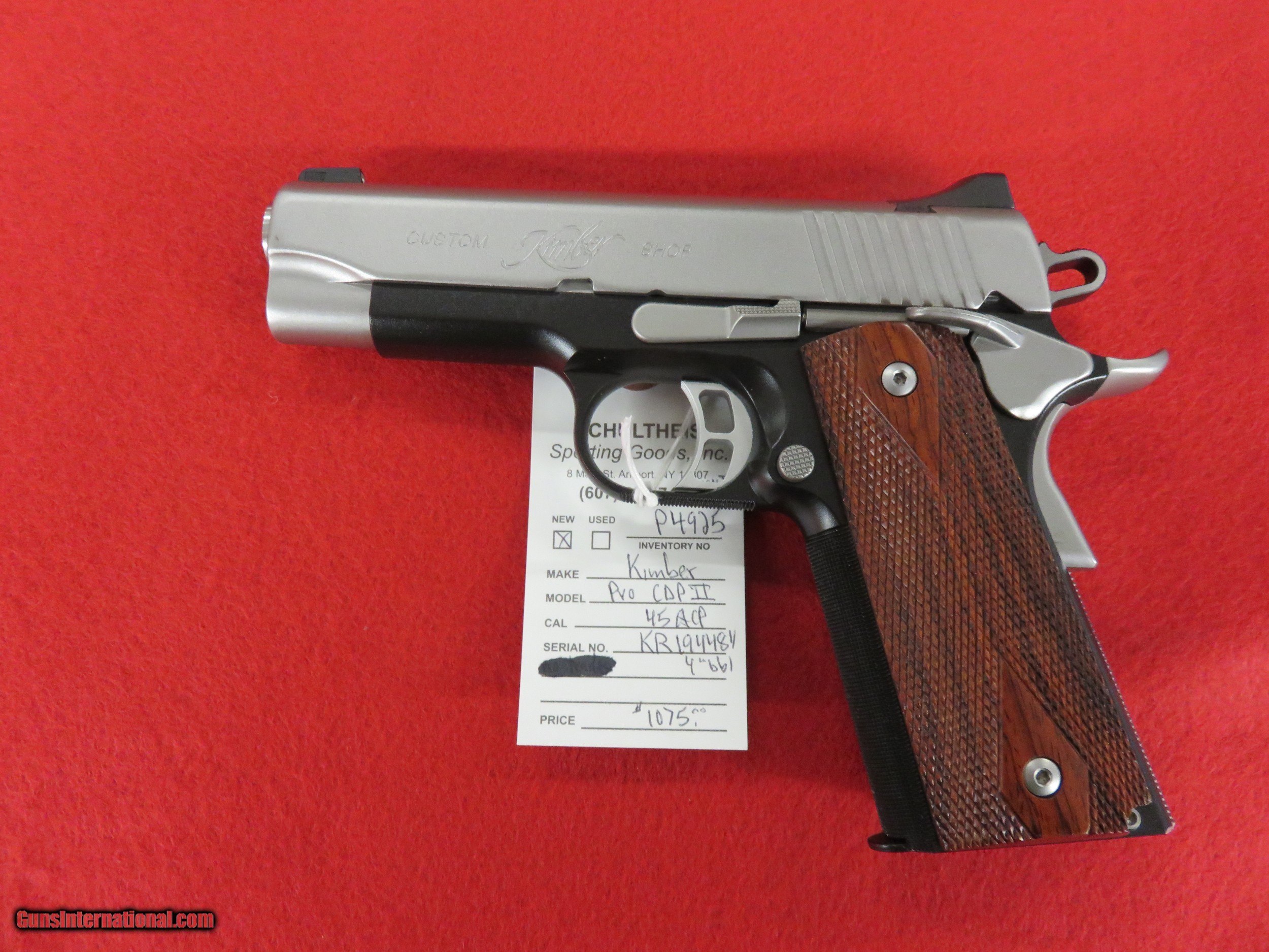 Description: Kimber Pro CDP II, 45 acp, NIB, 4" barrel, night sights, ambidetrous safety, rosewood double diamond grips, black frame, brushed stainless slide and back strap. SOLD Manufacturer: Kimber Model: Pro CDP II Caliber Info: 45acp Condition: NIB Barrels: 4 inches |
