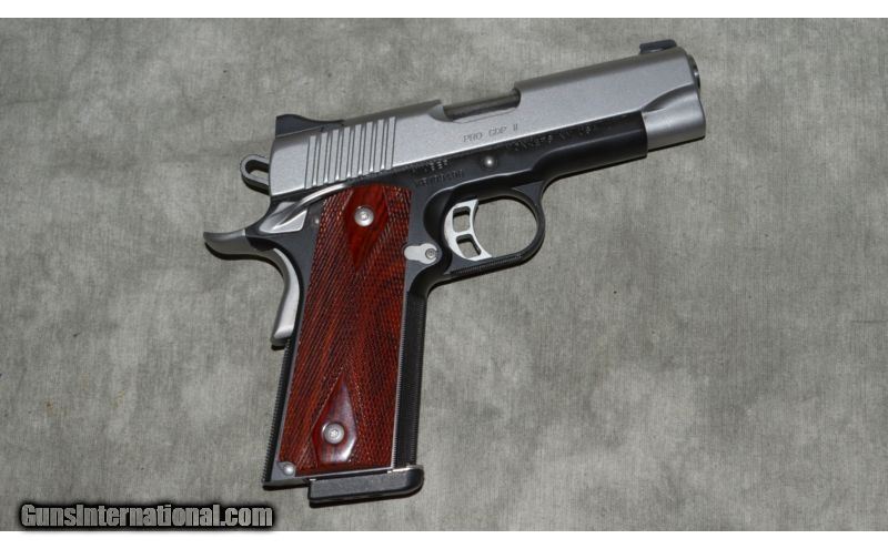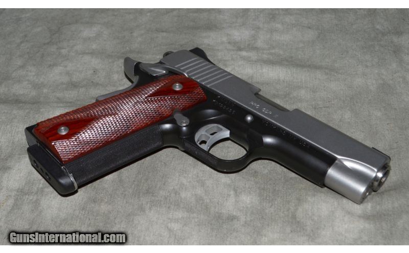 Description: This Kimber Custom Shop black and satin stainless two-tone 1911 features wooden grips, and MH3 night sights. It includes two magazines, factory case and the manual. SOLD Caliber Info: .45 ACP. Chambers: 7 + 1 capacity semi-automatic. Metal Condition: Very good. One scratch under slide lock pin. Wood Condition: Excellent. Bore Condition: Shiny and bright. Barrels: 4 inch stainless steel. Triggers: Stainless steel skeletonized trigger and hammer. Stock: Checkered hardwood grips. Weight: 30 oz. Sights: MH3 night sights, three dot system. Extras: Factory case, factory papers, and two mags total. Item Location: Rogers,, MN |