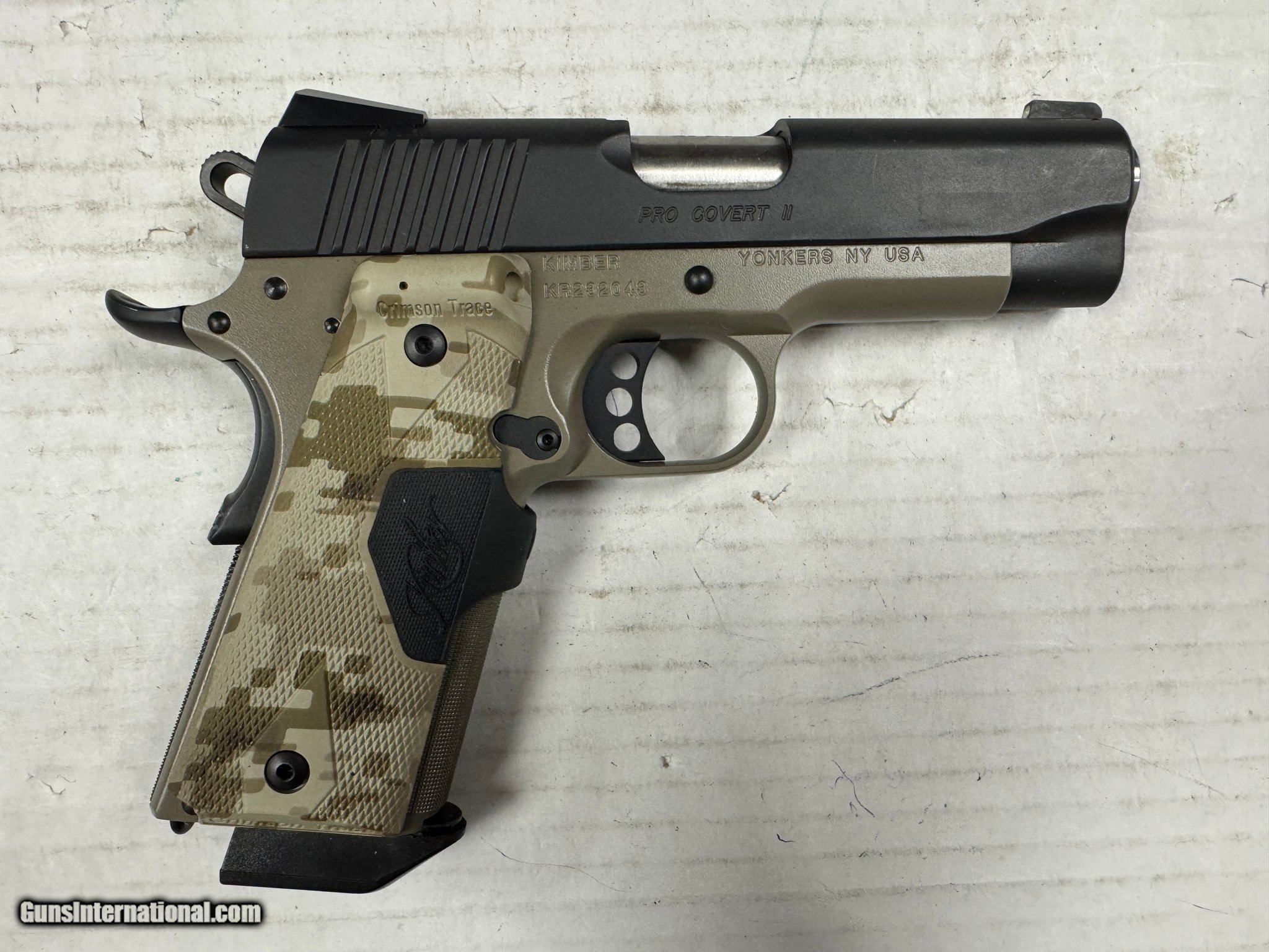 Description: Guns Listing ID: 571366 KIMBER Pro Covert II 45ACP Semi Auto Pistol, Desert Digital Crimson Trace Laser Grips -Firearm is in excellent condition -1x Mag -Crimson Trace Laser Grips SOLD Manufacturer: KIMBER Model: PRO COVERT II 1911 45 ACP Caliber Info: .45 ACP Condition: Used - Non-Certified Barrels: 4" BARREL Action: SEMI AUTOMATIC Finish: black/fde |