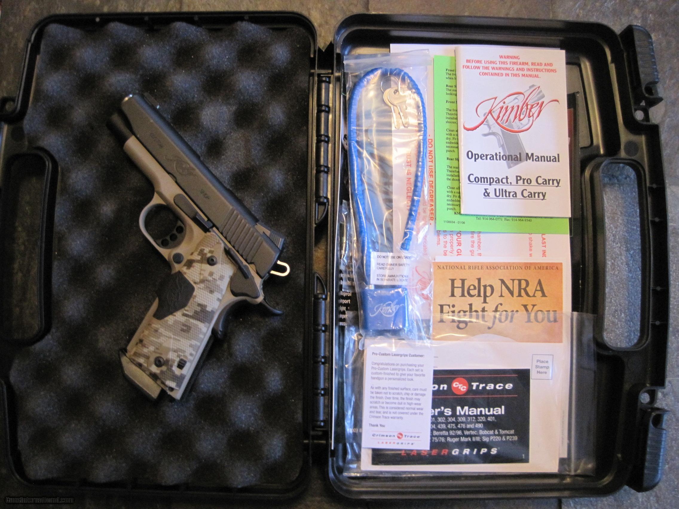 Description: Kimber Pro Covert II Crimson Laser Grips, Tritium Night Sights, 45 ACP. New, unfired In Box, Includes Manual and all paperwork, etc. Must Ship to FFL, No sales to CA. SOLD |