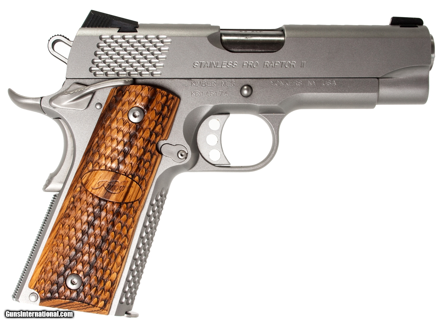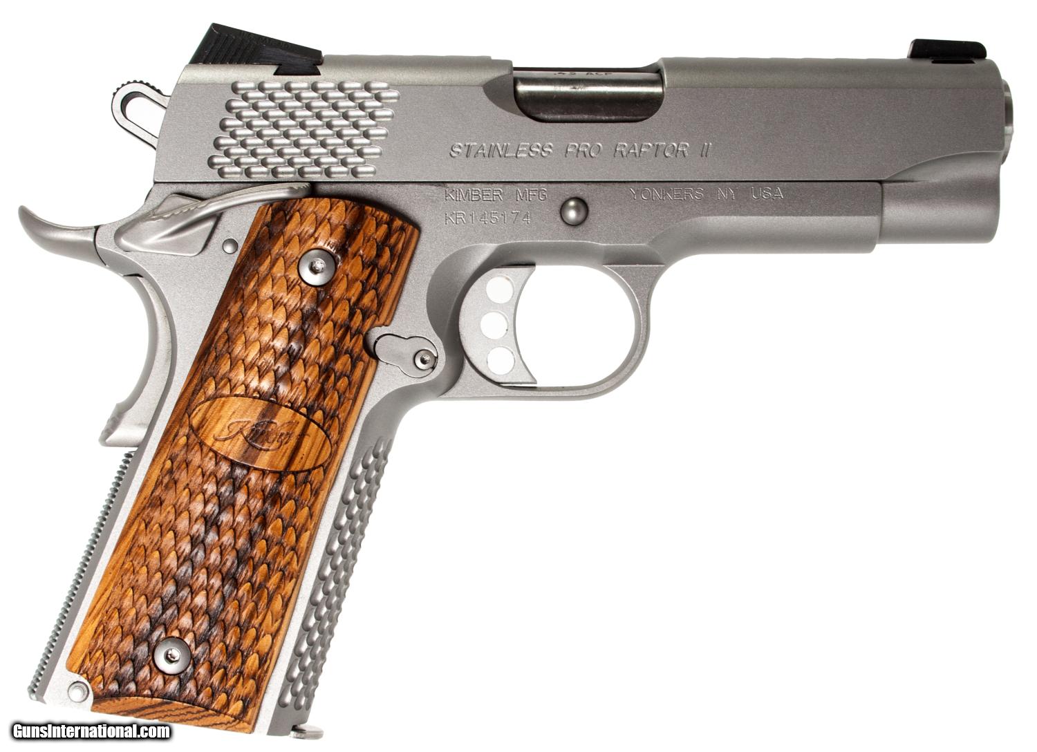 Kimber Pro Raptor II chambered in 45 acp with a 4 inch barrel stainless steel frame Kimber night sights and wood grips. This gun is in excellent condition and is covered by Dury's Lifetime Warranty.
