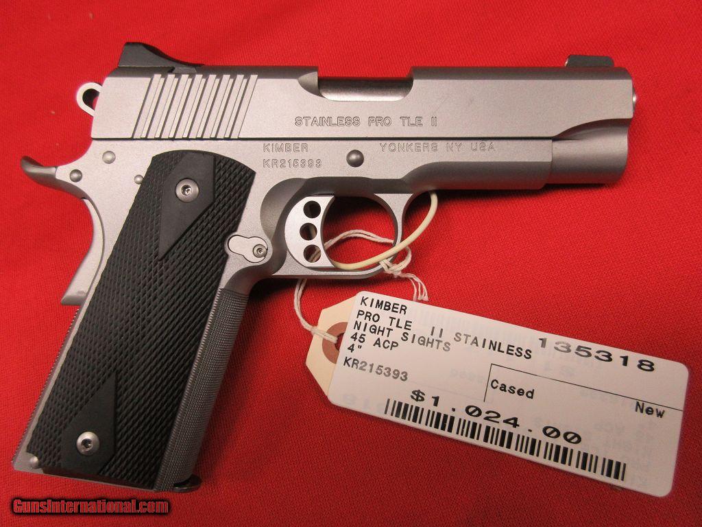Description: Kimber PRO TLE II STAINLESS 45acp 4" w/ Night Sights (NEW)-- !!! PRICE REDUCED !!! The Pro TLE II Stainless: brushed stainless finish, stainless slide and frame, fixed night sights, match grade barrel, chamber, and trigger, lowered and flared ejection ports, loaded chamber indicator, single sided safety, checkered magazine release, black rubber double diamond grips, and a checkered front strap and mainspring housing. SOLD |