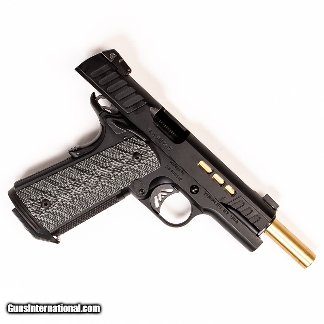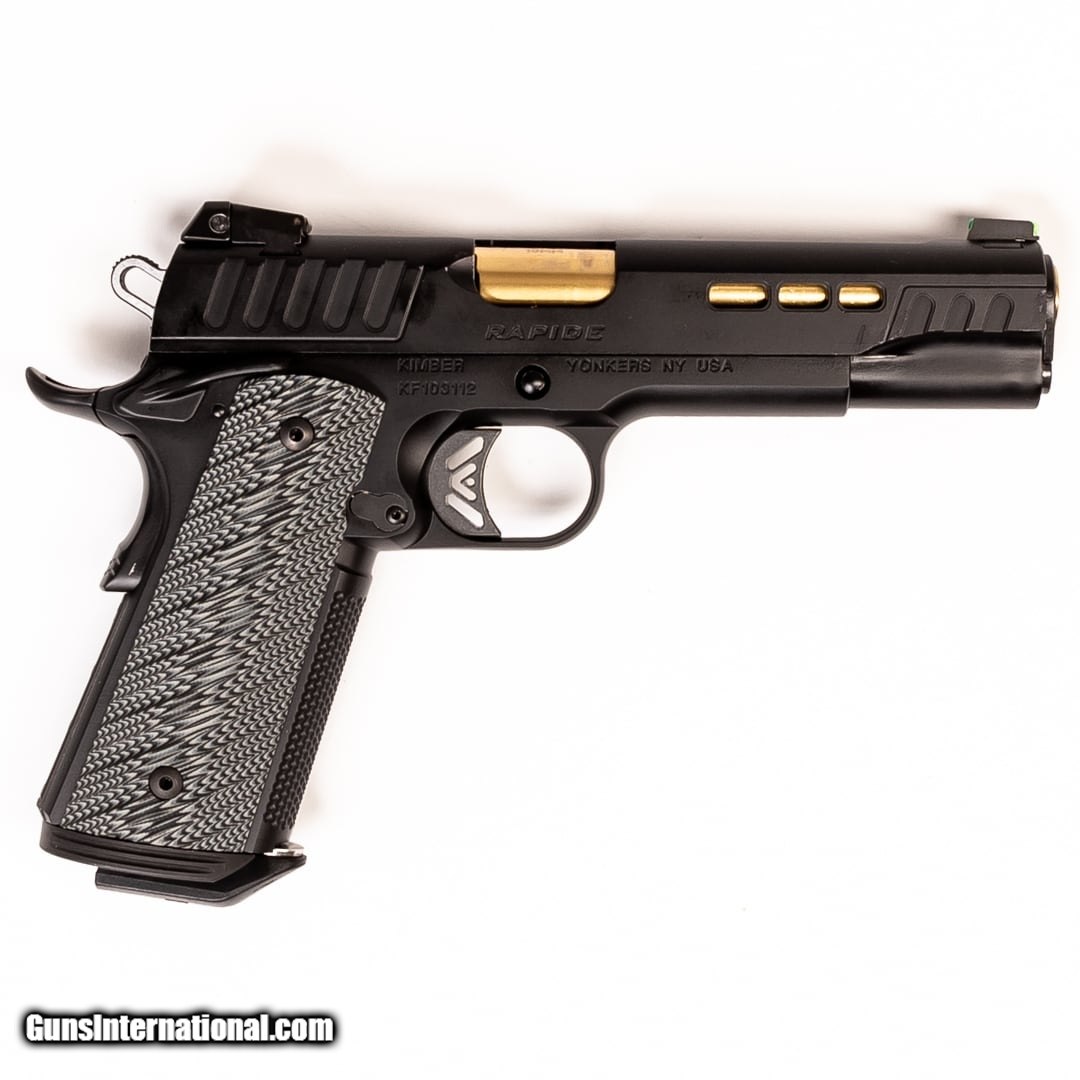 Description: Guns Listing ID: 463531 The Kimber Rapide offers rock-solid performance with style & class. It‚‚s a fantastic pistol for competition use, precision target shooting, and self-defense. This Rapide sports LPA fiber optic sights, with the original night sights included. It also comes with the owner‚‚s manual, one 8-round magazine, and a bushing too SOLD Manufacturer: KIMBER Model: RAPIDE Caliber Info: 10MM Condition: Used - Certified Barrels: 5 BARREL Finish: BLACK AND GOLD |