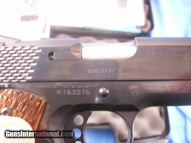 This is a Kimber Raptor II model semi-automatic pistol. It is in .45 ACP caliber with a 5" barrel. The condition is rated at 99% original with the case/papers/extra magazine/lock. It has been a safe queen and taken out only one time to shoot. It comes with everything and is in beautiful condition. If you have never shot a Kimber pistol then if you buy one you are in for a real treat. Very accurate and comfortable to shoot.