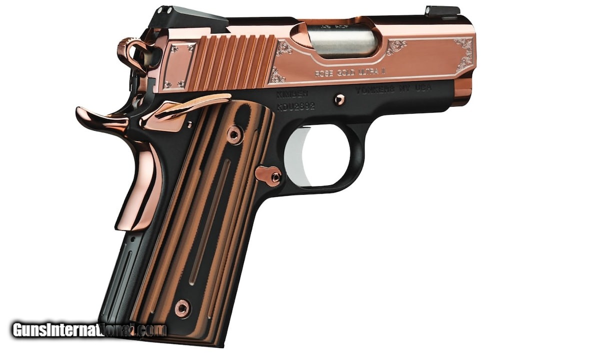 Description: Guns Listing ID: 525604 Combining dynamic style with a host of performance enhancing details, the new Kimber Rose Gold Ultra II is a striking 1911-style personal defense handgun with a precious-metal-like shimmer that creates a truly signature look. The Kimber Rose Gold Ultra II boasts a highly polished stainless steel slide with beautiful rose gold PVD coating and cut scroll engraving and border. Rose gold PVD-coated small parts and thin ball-milled G-10 grips accent the matte black Round Heel Frame, while Tactical Wedge 3-dot tritium night sights ensure rapid sight acquisition in low light environments. Additional features include an ambidextrous thumb safety and ball-milled grooves on the front strap. The Kimber Rose Gold Ultra II is easy to conceal and comfortable to carry, with a weight of just 25 ounces and barrel length of 3 inches. All edges are rounded and blended, preventing snags on clothing or holsters. SOLD Manufacturer: KIMBER Model: ROSE GOLD ULTRA II Caliber Info: 9MM LUGER (9X19 PARA) Condition: new Barrels: 3" BARREL Finish: ROSE GOLD |