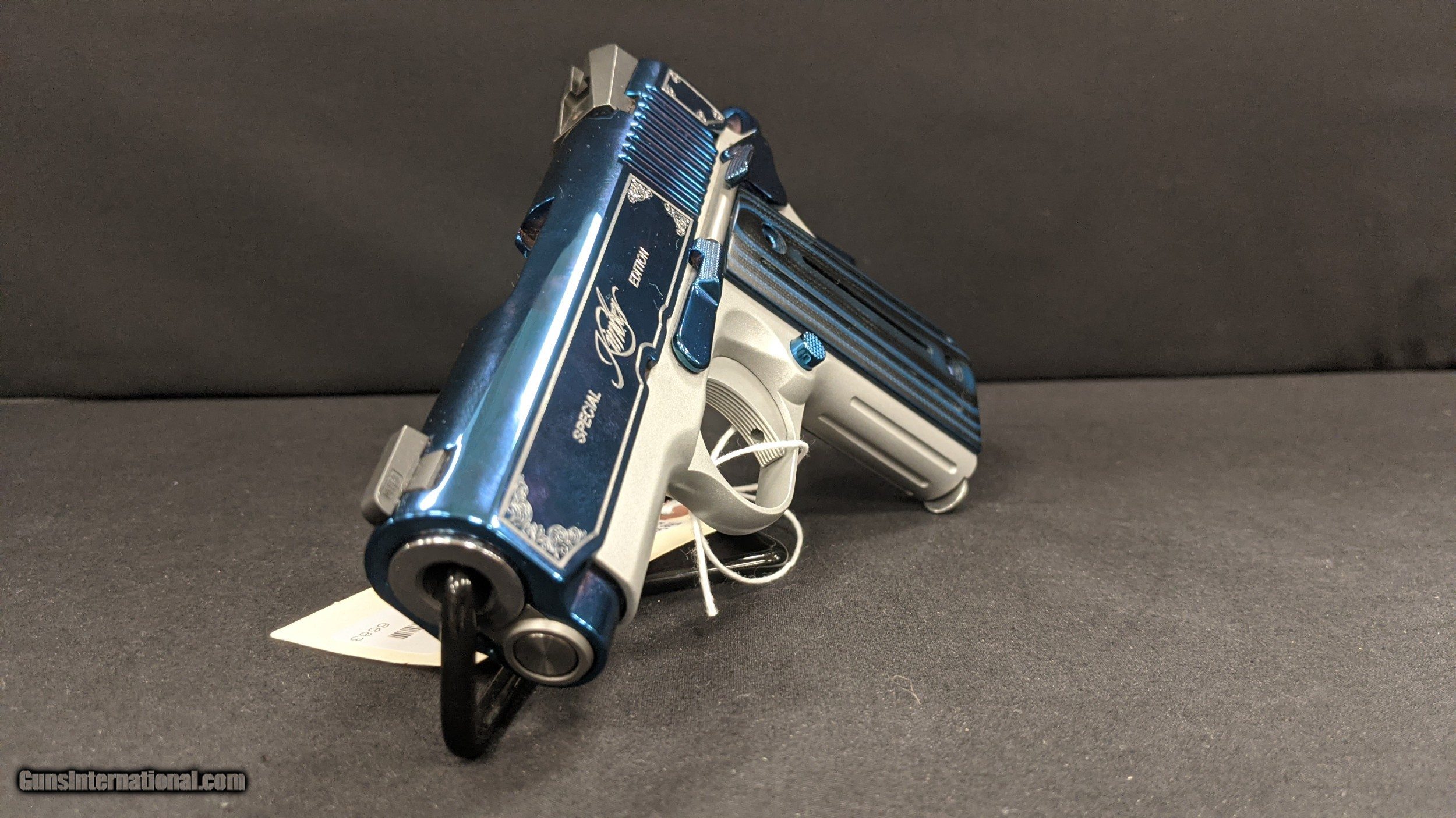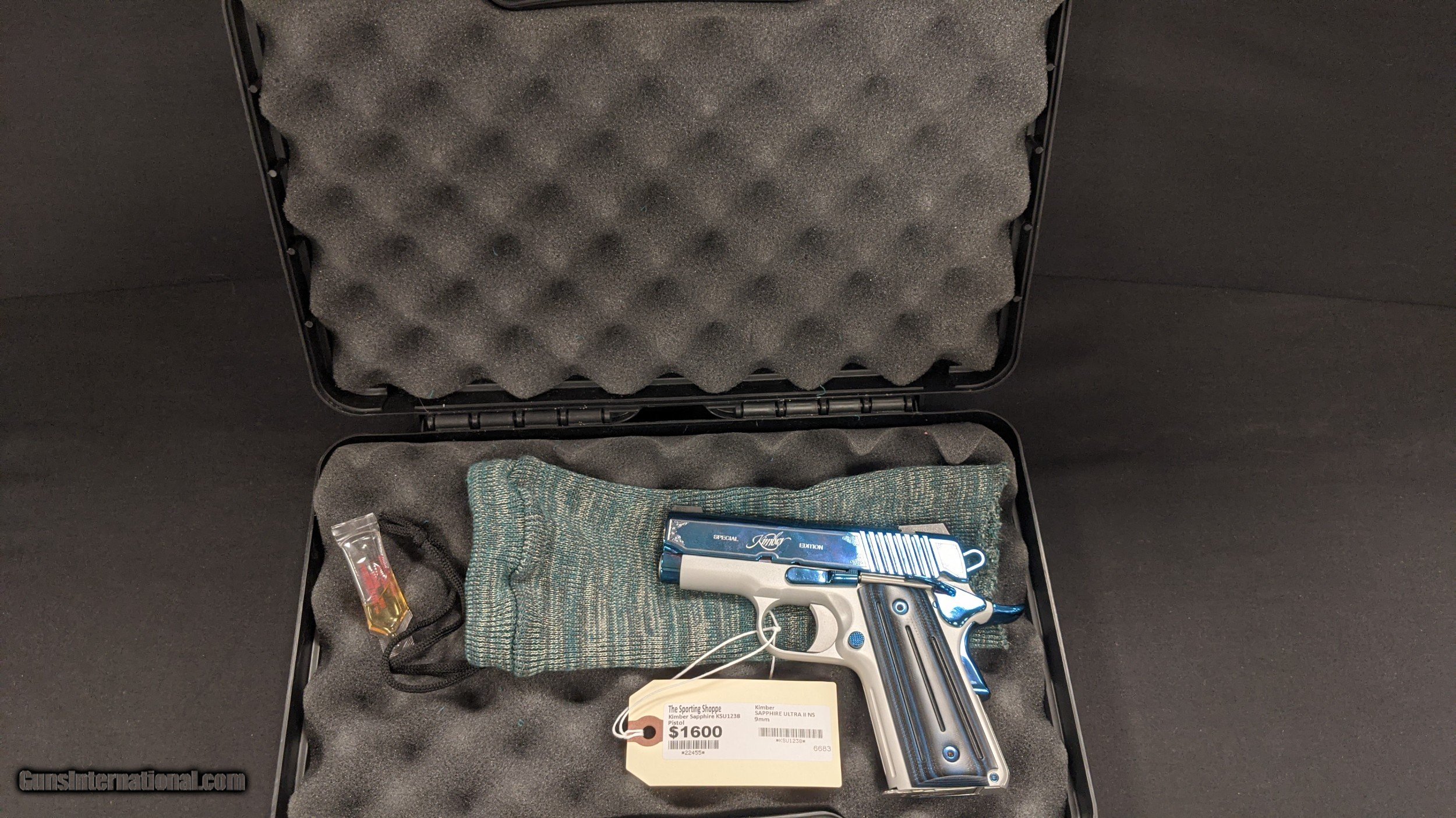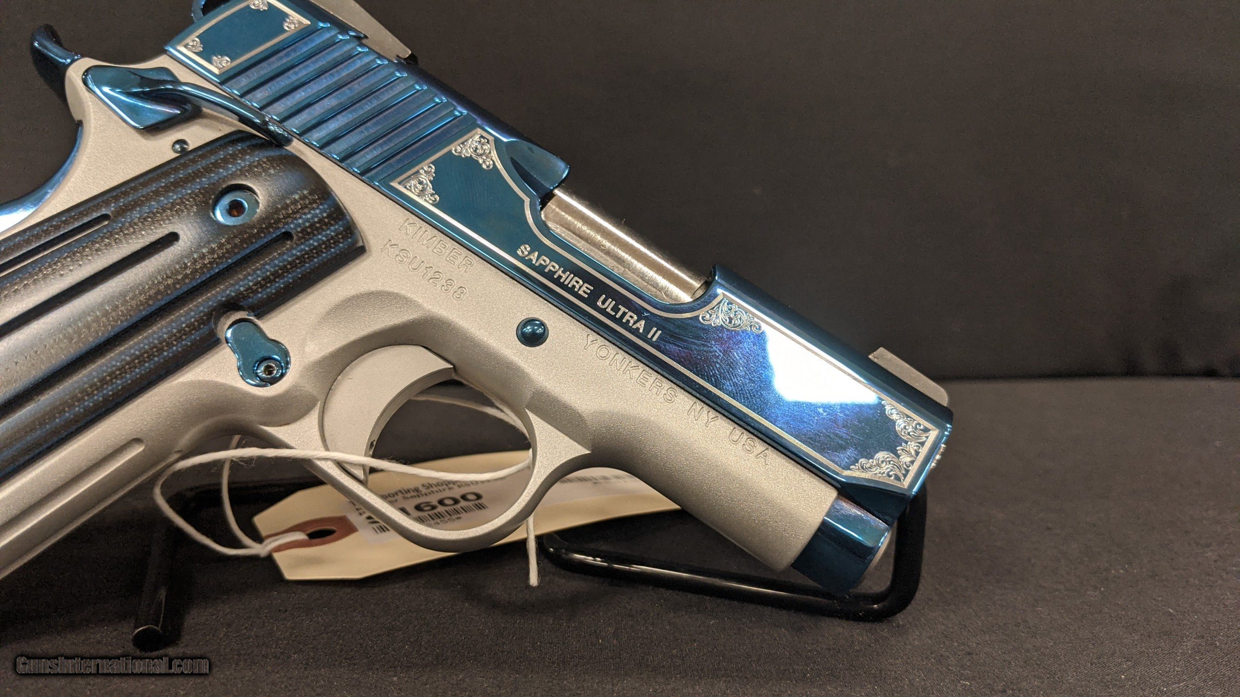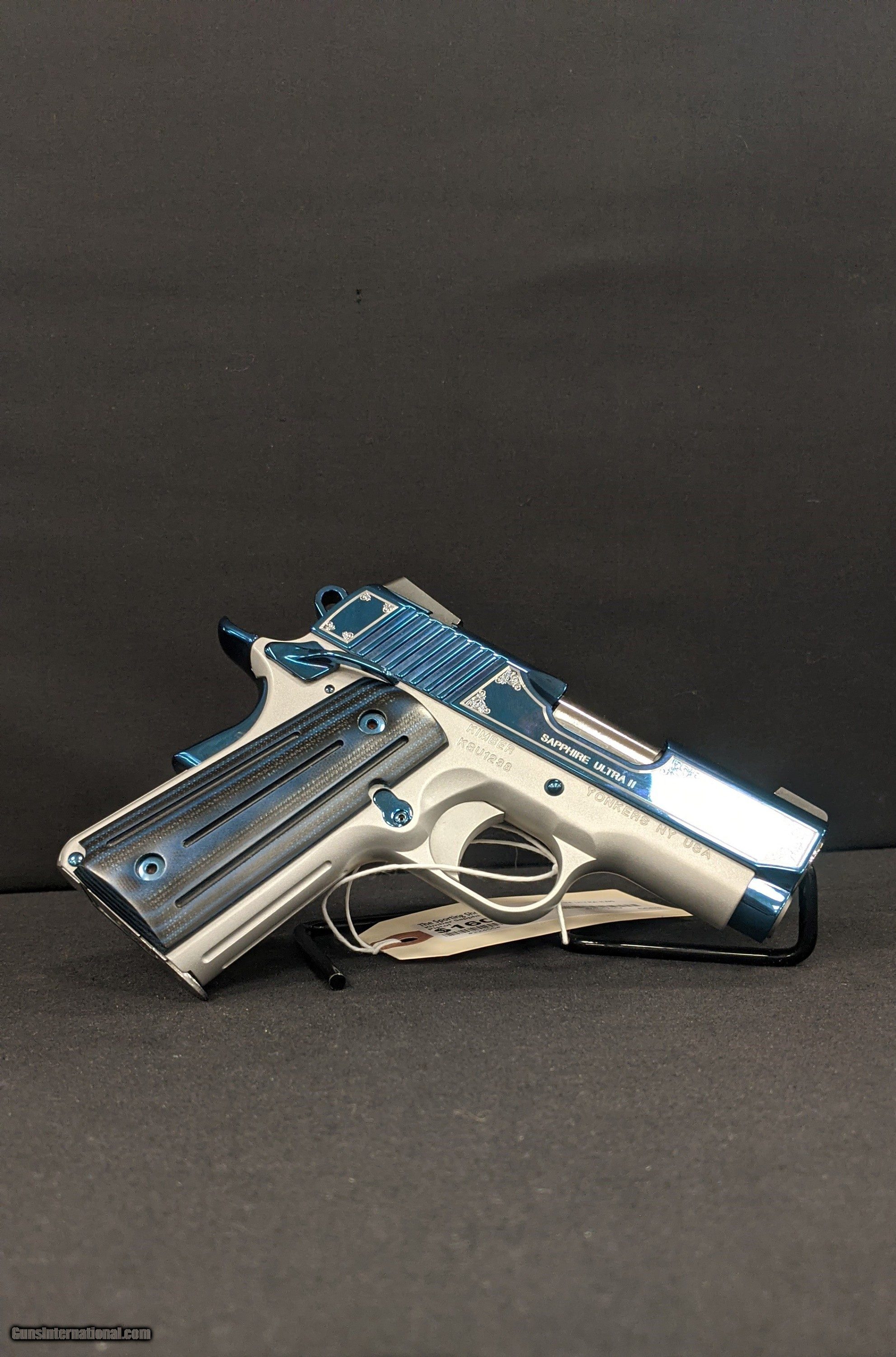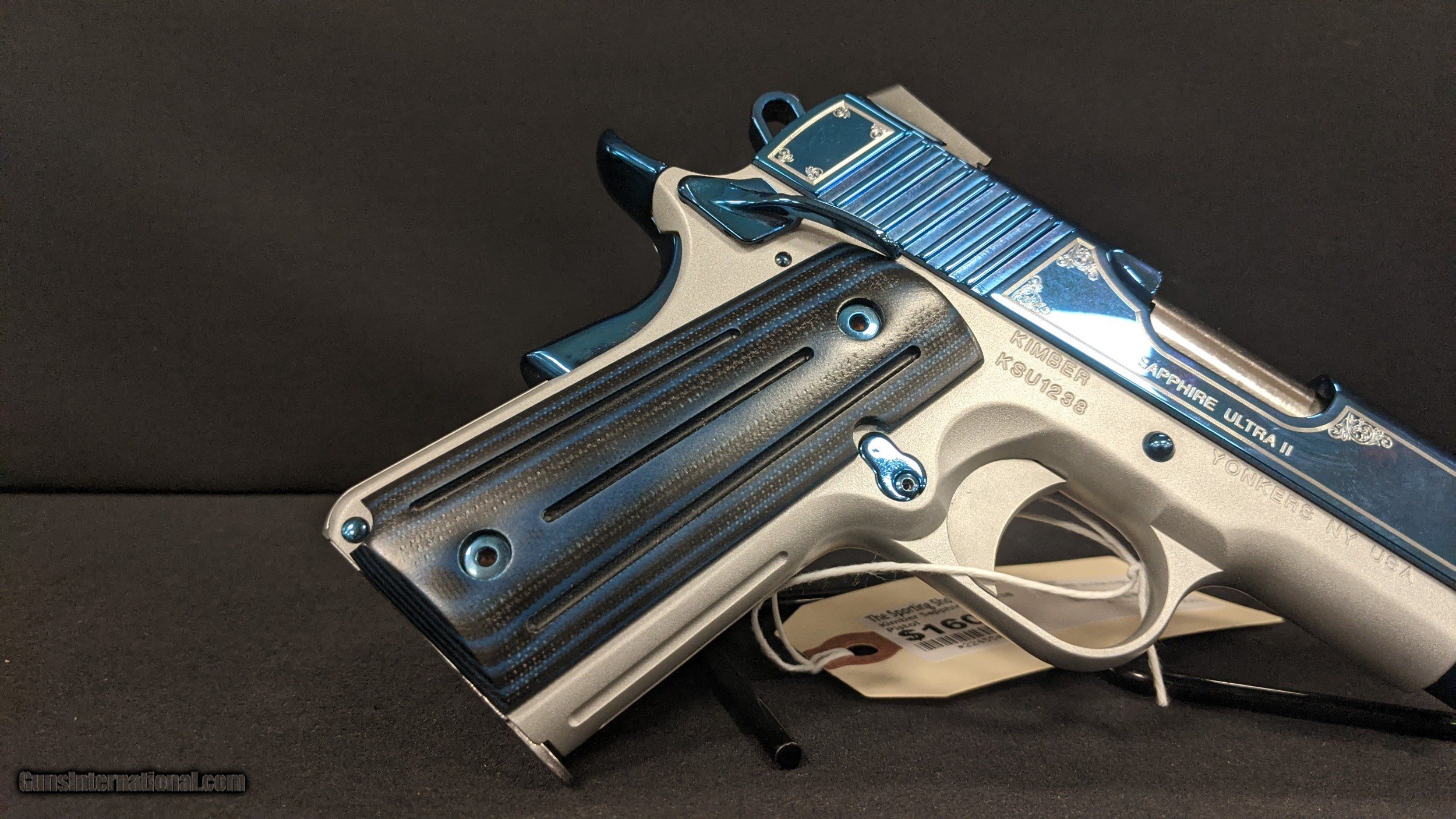 Description: The Sapphire Ultra II is a striking personal defense pistol that combines dynamic style with a host of performance-enhancing features. This Sapphire Ultra II is equipped with a 3” barrel, 3 Dot Night Sights, Blue/Black ball-milled G-10, and a Satin Silver finish. This package comes with one magazine, one lock, one Sock, and the original hard case. The overall condition is excellent with little to no handling marks. Kimber Sapphire Ultra II Single Action 9mm 3.75" Handgun