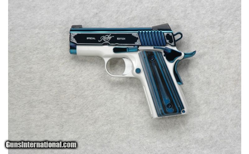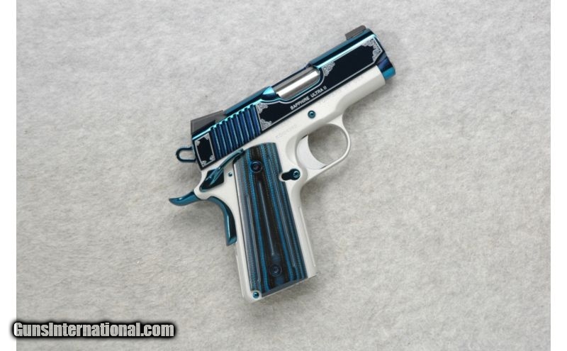 Description: Polished sapphire blue slide is scroll and border engraved. SOLD Caliber Info: 9mm Metal Condition: Excellent Bore Condition: Excellent Barrels: 3 inches. Stock: Two tone black/blue laminate with three vertical recessed lines. Sapphire blue slide. Satin stainless steel frame. Weight: 27 oz. Sights: Blade front. Notch rear. 3 dot night sights. Extras: With Box Item Location: Richfield, WI |