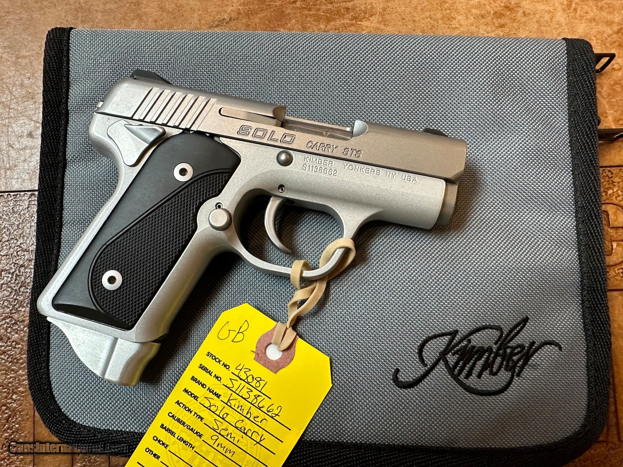Description: Guns Listing ID: 1229700 This Kimber Solo Carry comes with one magazine and factpry soft case. SOLD Manufacturer: KIMBER Model: SOLO CARRY Caliber Info: 9MM LUGER (9X19 PARA) Condition: Used - Non-Certified Barrels: 2.7 BARREL Finish: STAINLESS |