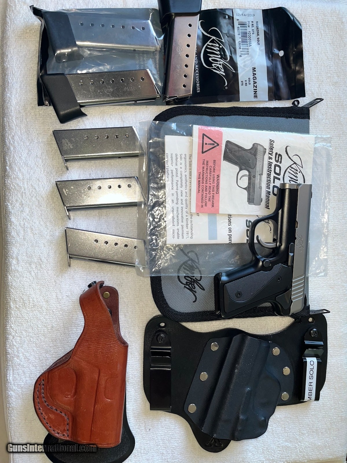 Description: Guns Listing ID: 821996 Comes with 6 magazines! 3 extended grip, 3 regular, one brown leather holster, one kydex holster. Original paperwork and kimber soft carry case. Magazine capacity: 6 rounds Height (inches) 90° to barrel: 3.9 Weight (ounces) with empty magazine: 17 Length (inches): 5.5 Frame: Aluminum with KimPro II Finish Frame Width (inches): .995 not including safety Slide: Stainless steel with Satin silver finish Barrel: 2.7 inches; Stainless steel Twist rate (left hand): 10 Sights: Fixed low profile Sight Radius (inches): 4.4 Grips: Black synthetic; Checkered / smooth Trigger: Single action striker-fired Factory setting (approximate pounds): 7 Comes with 6 magazines! 3 extended grip, 3 regular, one brown leather holster, one kydex holster. Original paperwork and kimber soft carry case. SOLD Manufacturer: KIMBER Model: SOLO CARRY Caliber Info: 9MM LUGER (9X19 PARA) Condition: Used - Non-Certified Barrels: 2.7 BARREL Finish: STAINLESS AND BLACK |