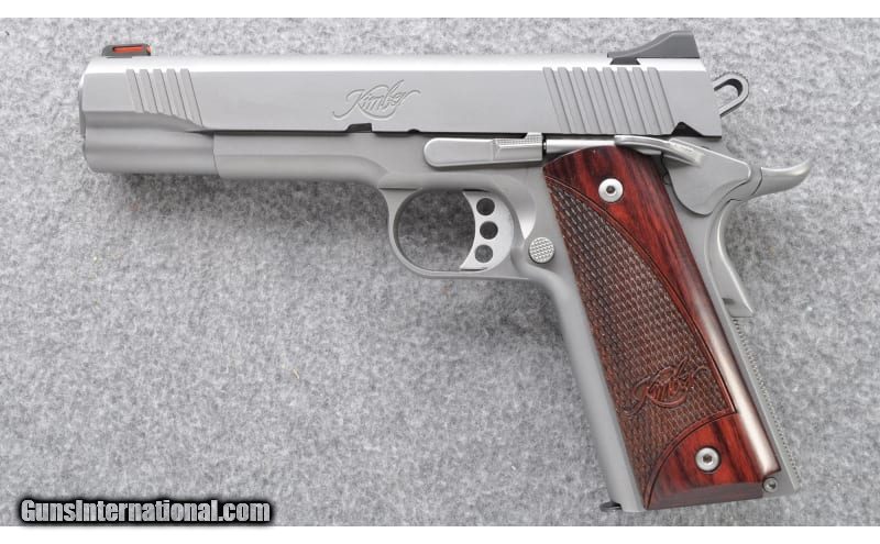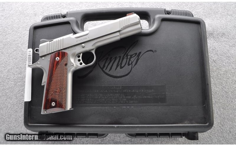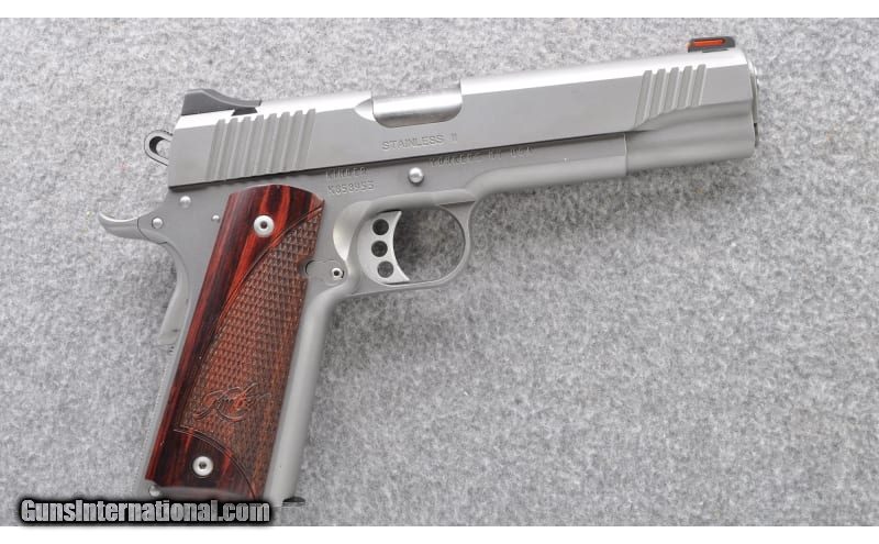 Description: The Kimber Stainless II features a full-length guide rod, Stainless Steel slide and frame, rosewood grips and Match grade barrel with stainless steel bushing. .45 ACP SOLD Metal Condition: Very good with no discernable marks Wood Condition: Grip panels are excellent Bore Condition: Sharp & bright Barrels: 5" Match Grade Triggers: Match Grade adjustable Weight: 38 oz. Sights: Drift adjustable Red fiber optic pipe front and low profile rear Item Location: Grand Junction, CO |