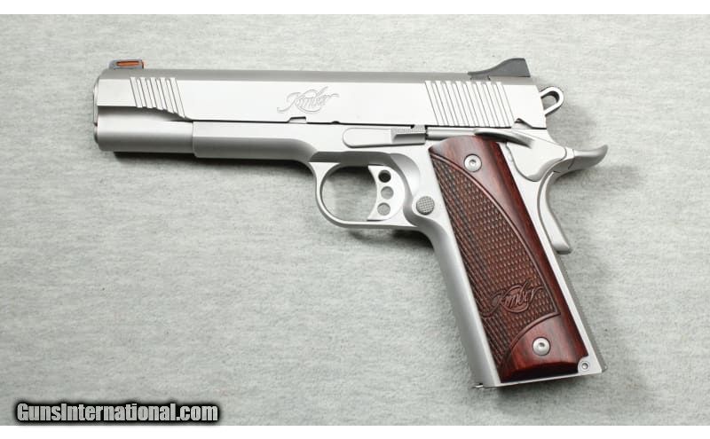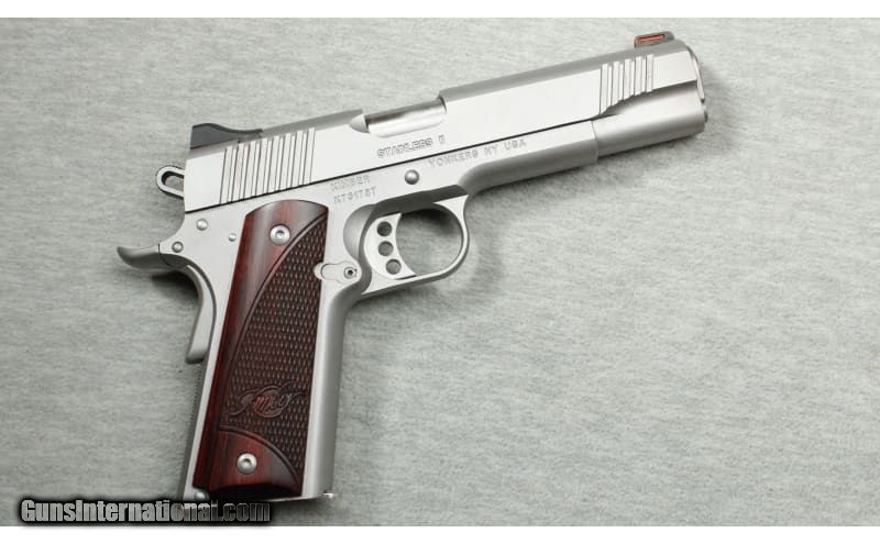Description: Excellent condition, light wear and handling marks, comes with two mags and case. Kimber 1911 .45 auto pistol, 5" barrel, matte stainless finish, notch rear & fiber front sights, aluminum single action trigger, lightweight hammer, extended safety lever & grip safety, front & rear slide serrations, checkered flat main spring housing and checkered premium wood grip panels. .45 Auto SOLD Chambers: Semi auto Metal Condition: Excellent Bore Condition: Bright Barrels: 5 Triggers: Single action Butt Pad: Wood grips Sights: "Square notch rear, red fiber fornt sights Item Location: La Vista, NE |