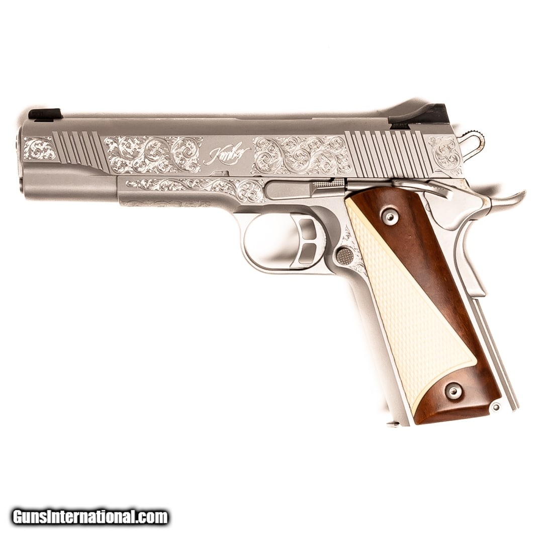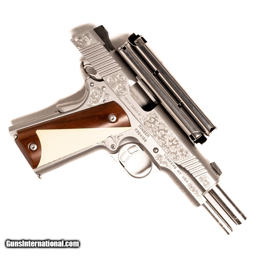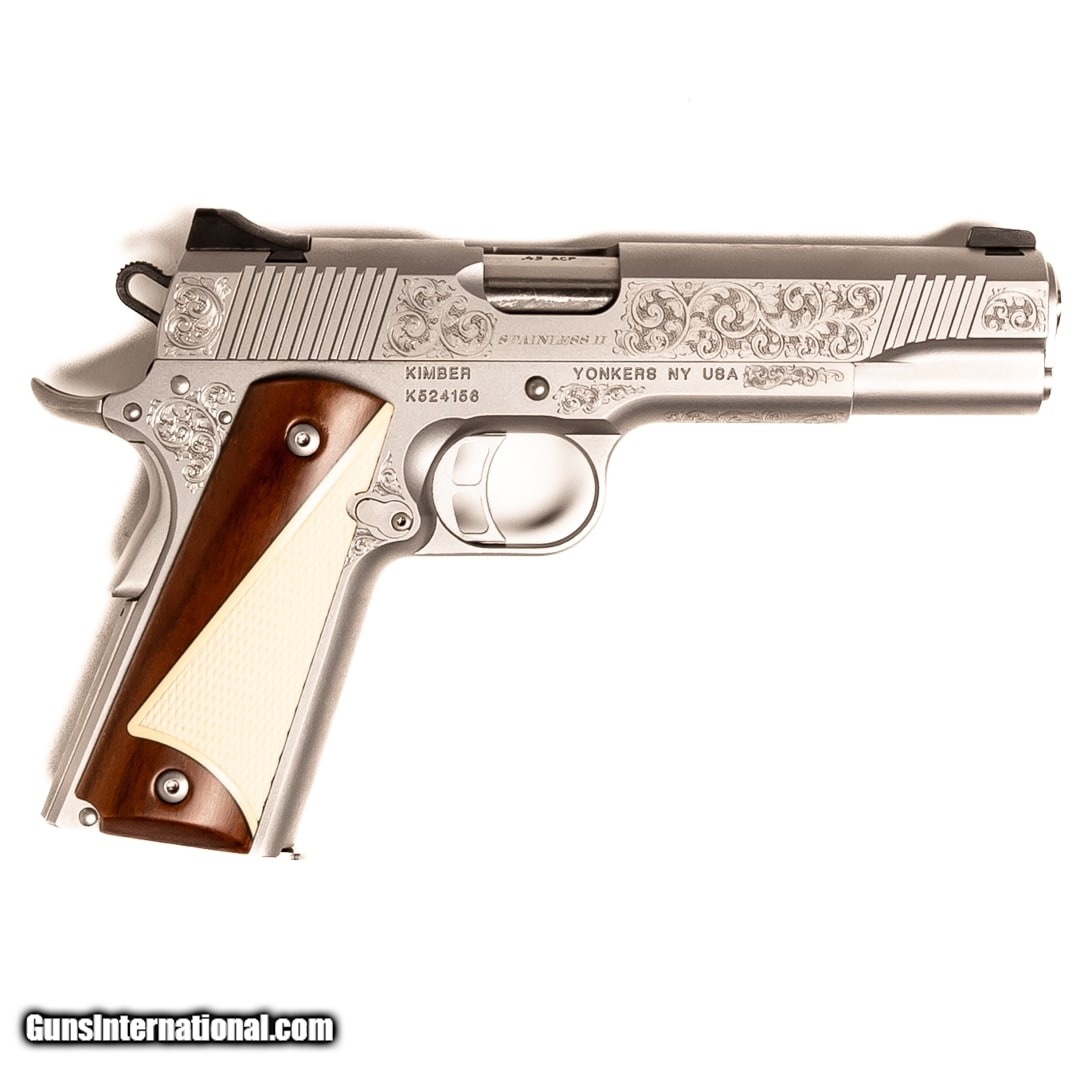 Description: Guns Listing ID: 796042 The accuracy, dependability and renowned Kimber features of the Stainless II family set the standard against which all other 1911 brands and models are measured. The Kimber Stainless Target II is a premium quality 1911 that’s perfect for precision target shooting, competition, and recreational use. It features match grade components, enhanced sights, custom Kimber grips, aggressive checkering on the back of the frame, and front & rear slide serrations. This handgun features two 8-round magazines, one 7-round magazine, and Paisley engravings on the slide and frame. Get the best bang for your buck when you get a Certified Used Firearm . When you see the Certified Used stamp on any of our firearms, you can be confident that you’re getting exactly what you want – a gun only in very good to excellent condition and held to the highest quality standard. All Certified Used Guns come with a ‘no questions asked’ return policy . PLUS, ALL CERTIFIED USED GUNS SHIP FREE! SOLD Manufacturer: KIMBER Model: STAINLESS II Caliber Info: .45 ACP Condition: Used - Certified Barrels: 5 BARREL Finish: STAINLESS |