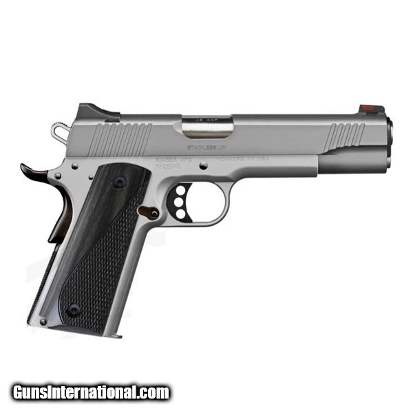 Description: The STAINLESS LW is a limited time special offering 1911, with white dot rear sight and red fiber optic front sights, weight reducing the aluminum frame, contrasting black small parts and sharp looking gray laminate grips with a checkered gripping area for positive hold round out this unique package. Includes a match grade stainless barrel with 8rd magazine. Kimber Stainless LW Arctic .45ACP Handgun