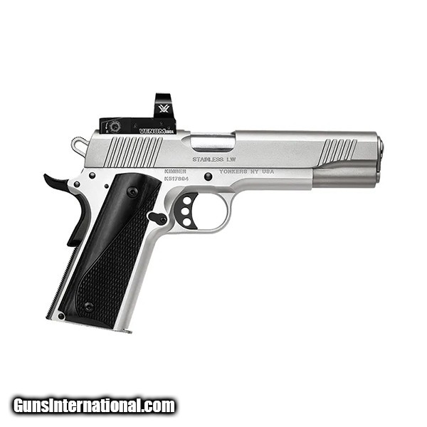 Description: The STAINLESS LW OI Arctic is a special offering 1911, with 6MOA Vortex Venom red dot optic, weight reducing aluminum frame, contrasting black small parts and sharp looking gray laminate grips with checkered gripping area for positive hold round out this unique package. Match grade stainless barrel with 9 rd. magazine (9mm).