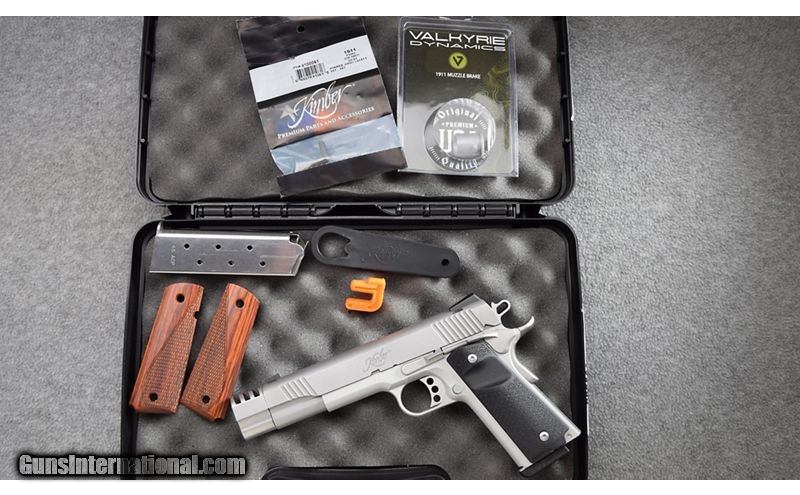 Description: This Kimber Light Weight is excellent throughout! Complete with original case, manual, ambidextrous safety, muzzle brake, extra mag, original wood grips. Very nice gun! .45 ACP SOLD Metal Condition: Excellent Wood Condition: Excellent Bore Condition: Excellent Barrels: 5" with Muzzle Brake Triggers: Factory Butt Pad: Textured Black Grips with Right Thumb Groove Weight: 32 oz. Sights: Three Dot White Sights Item Location: Wheeling |