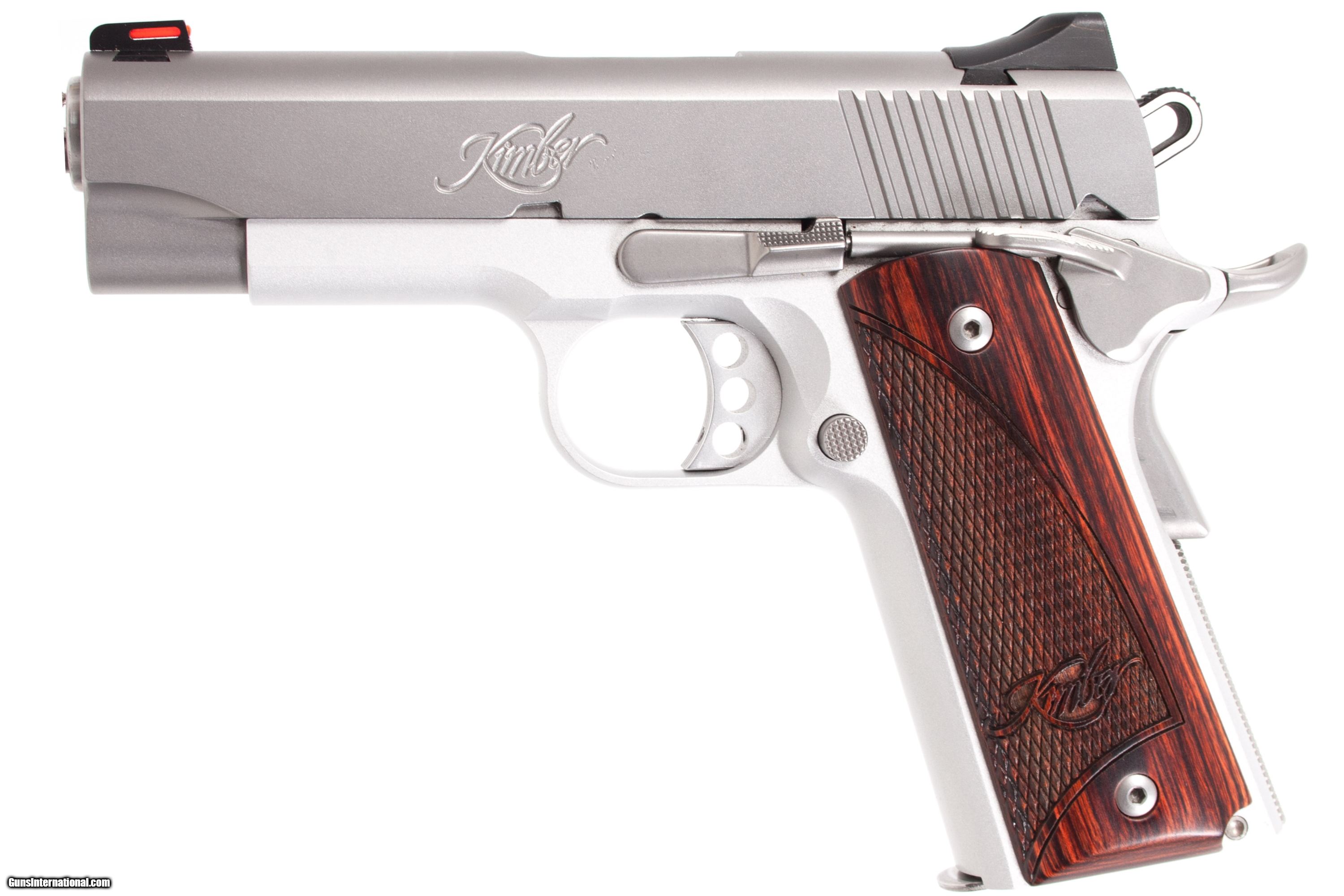 Kimber Stainless Pro Carry 2 45ACP 4in barrel fixed sights red fiber front alloy frame skeleton hammer and Kimber checkered wood grips. This gun is in excellent condition and is covered by Dury's Lifetime Warranty.