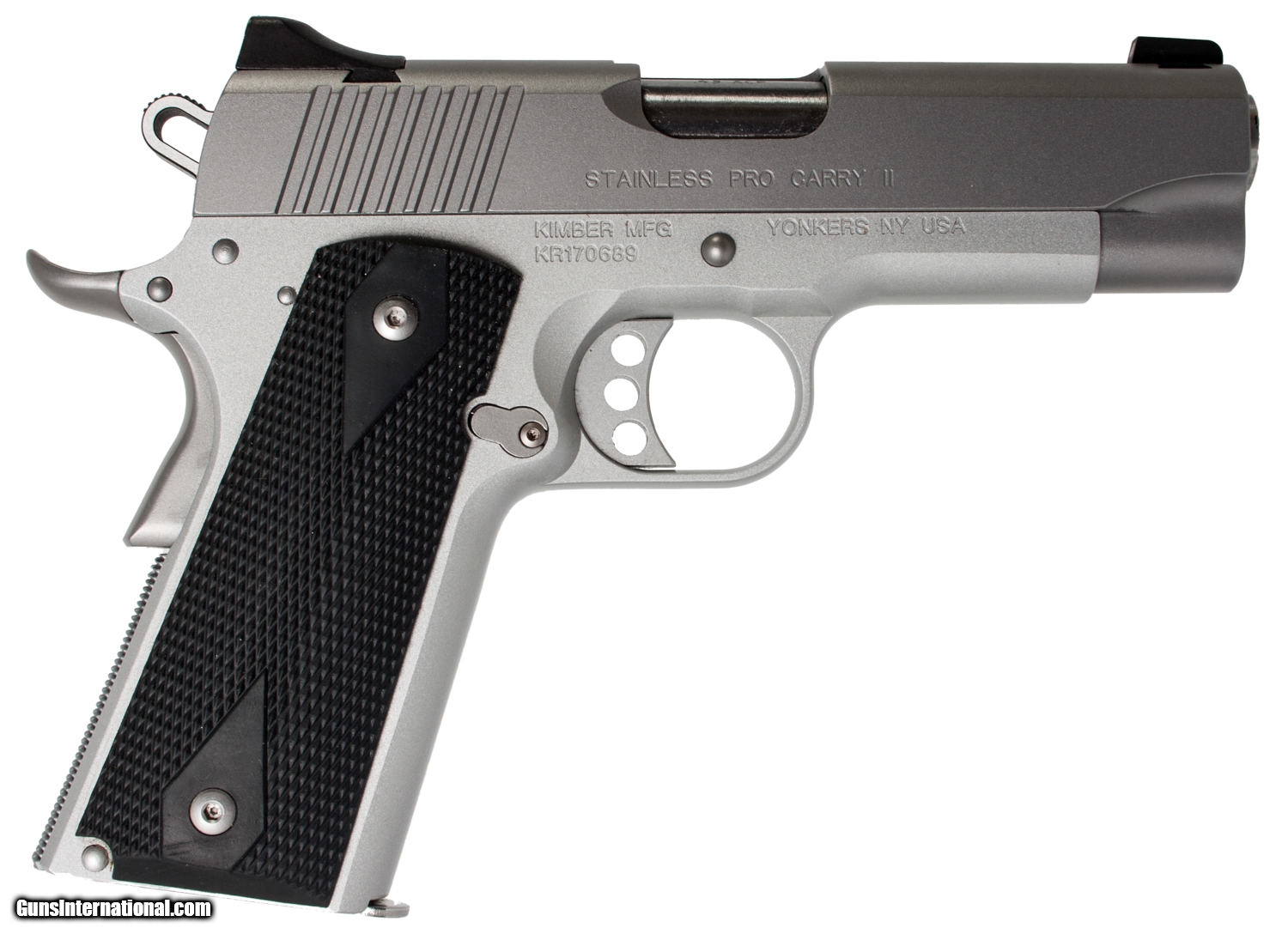 Kimber Stainless Pro Carry II chambered in 45 acp with a 4 inch barrel and a case. This gun is in excellent condition and is covered by Dury's Lifetime Warranty.